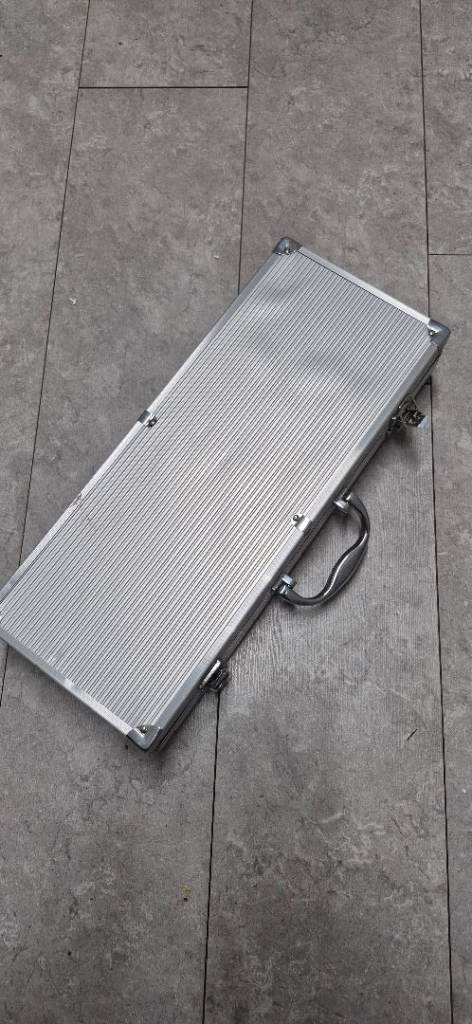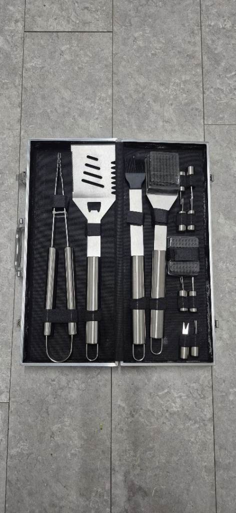 13 pieces including: tongs, spatula, brush, grill brush, extra brush head, 8 meat picks