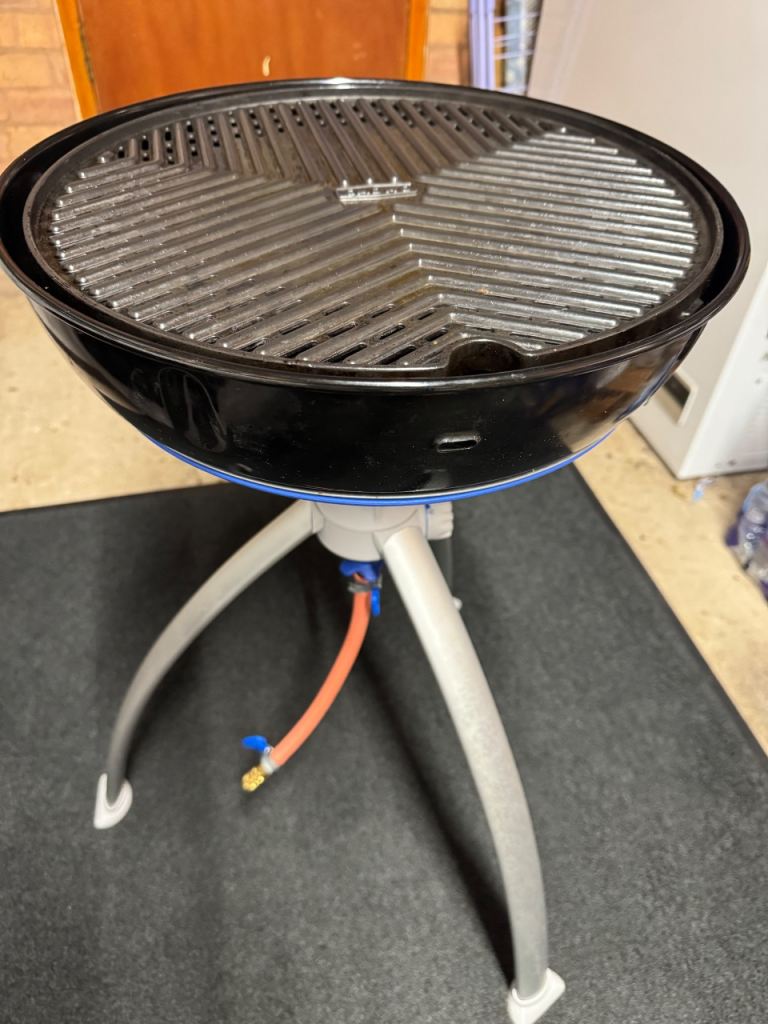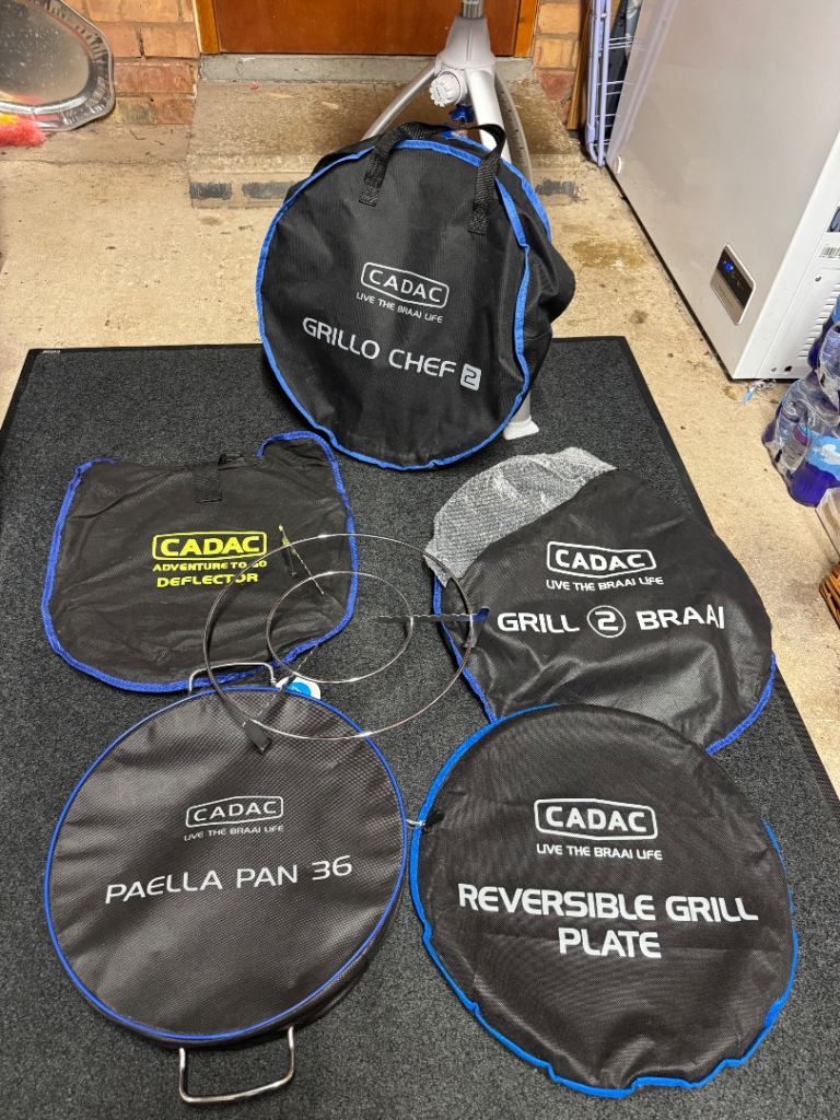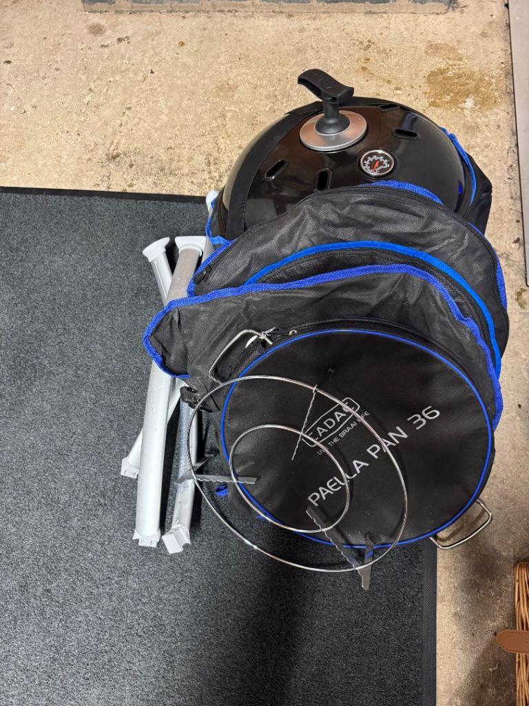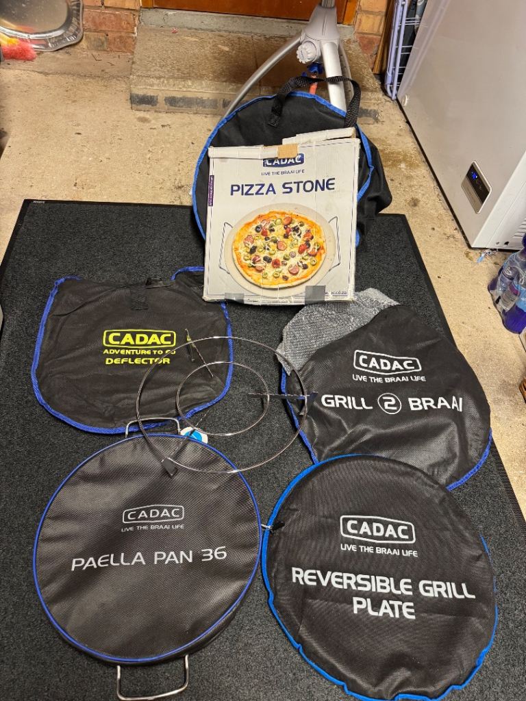 Cadac bbq only used once fab bbq but we’ve brought a ninja wood smoker bag for our travels now. So many extras see in pics the only pan used is the one inside the bbq pictured. Pitza stone as been used as well but in great condition. Also comes with a rain cover as pictured. Also comes with a 3.9 calor gas bottle with a quick release gas pipe as pictured not sure how much is left in there. Please note this is collection only no postage please note advertising elsewhere.