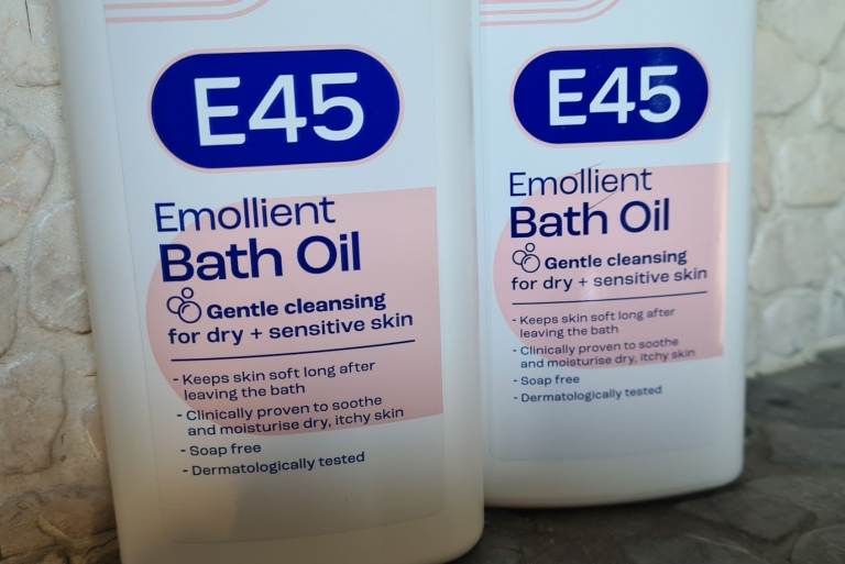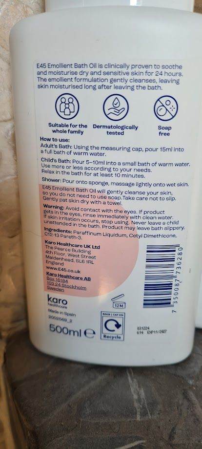 (x2) E45 emollient bath oil moisturiser, dry skin, sensitive, perfume free LARGE 500ml.