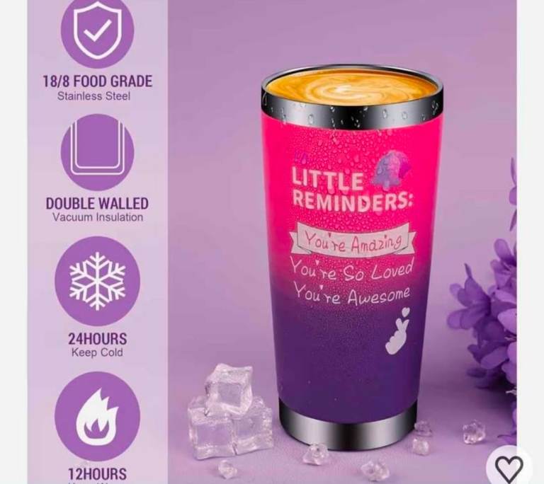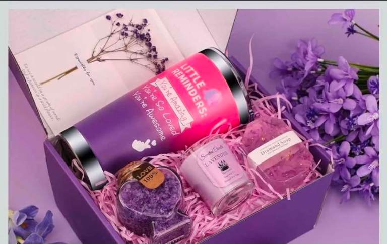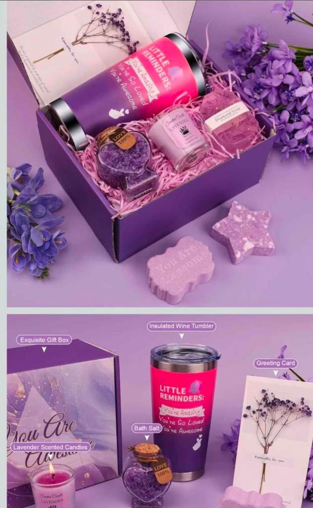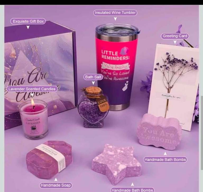 Comes with a lavender scented candle, bath salts, soaps, and an insulated tumbler.