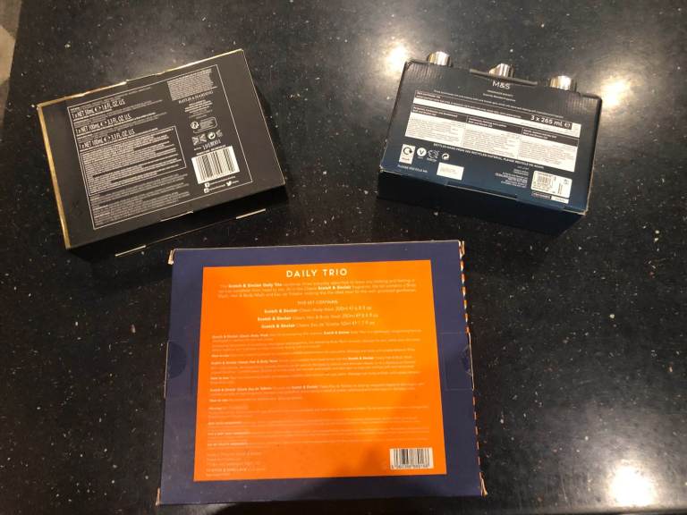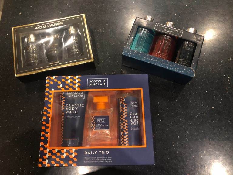Baylis & Harding for him gift set, M&S Fragrance Society - Bath and shower gel collection (unisex), Scotch & Sinclair Daily Trio gift set and Davidoff Cool Water Men Eau De Toilette Spray 40ml, Shower Gel 50ml & After Shave Balm 50ml gift set.