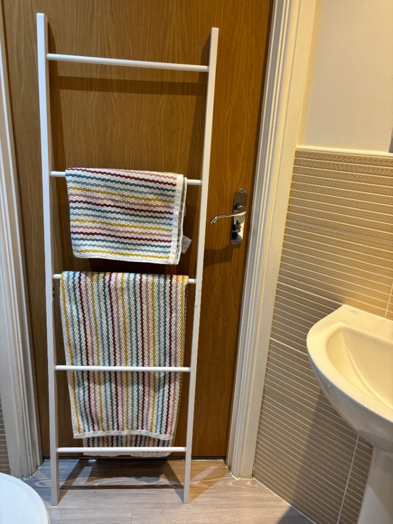 Posting for 8+ months🛁 White Freestanding Ladder Towel Rail – Modern Bathroom Storage