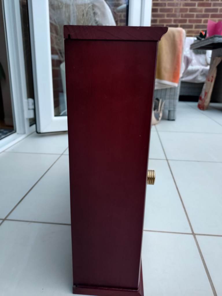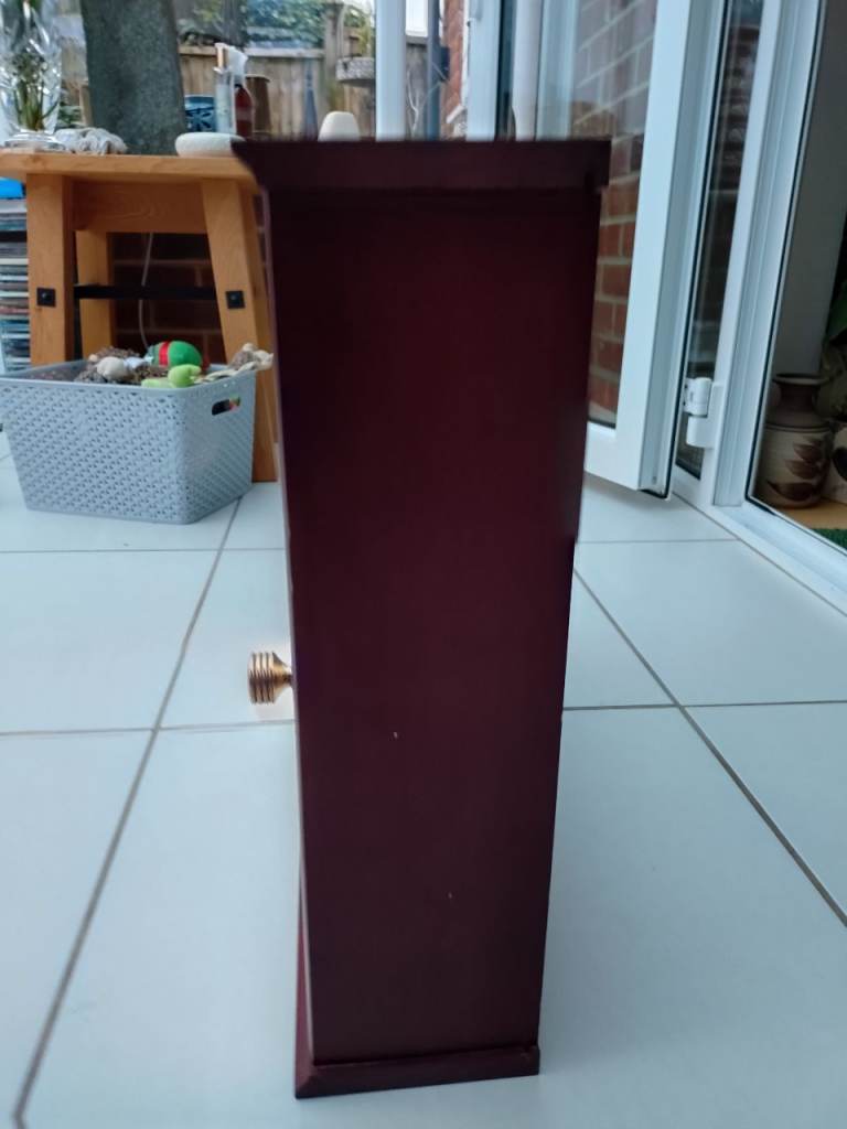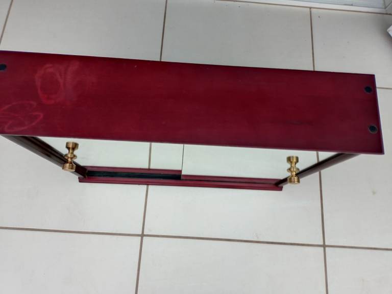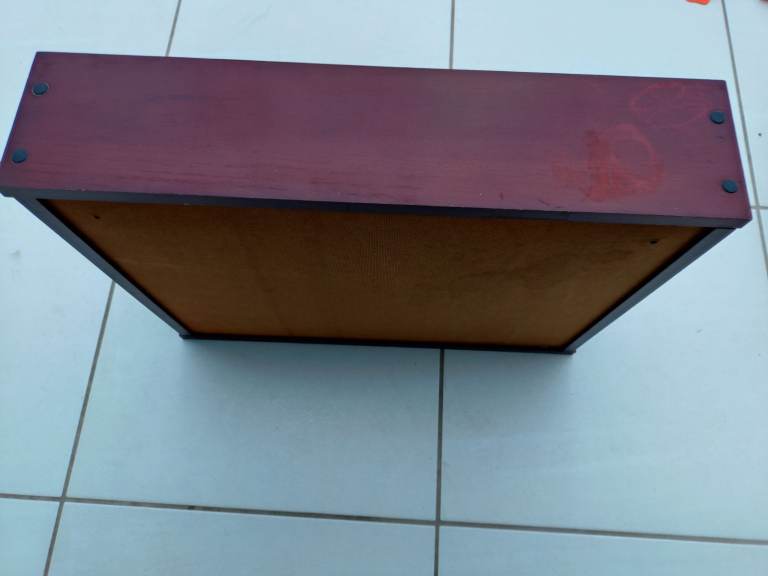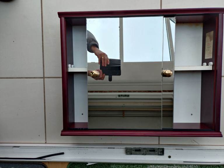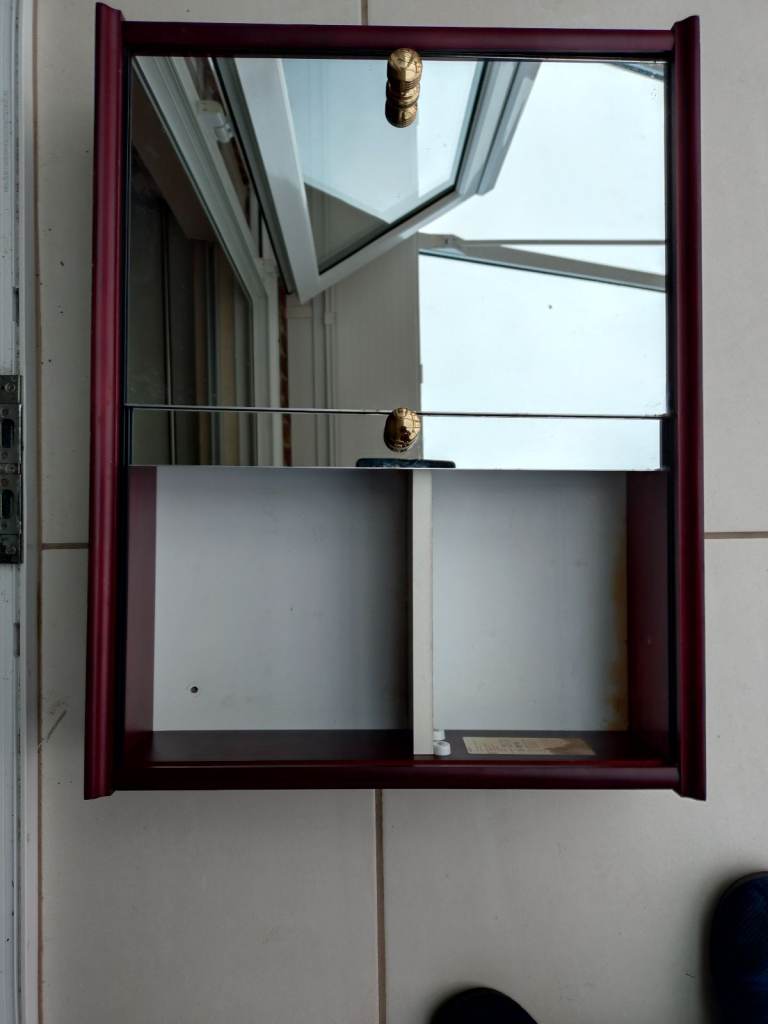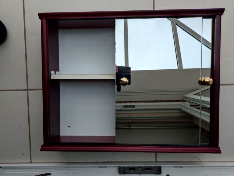 There are marks on top of the cabinet one end where bottles were placed, in places looking a little bit tired, The shelf has some paint splashed on the underneath at one end, otherwise the items are in good condition and will compliment your bathroom.