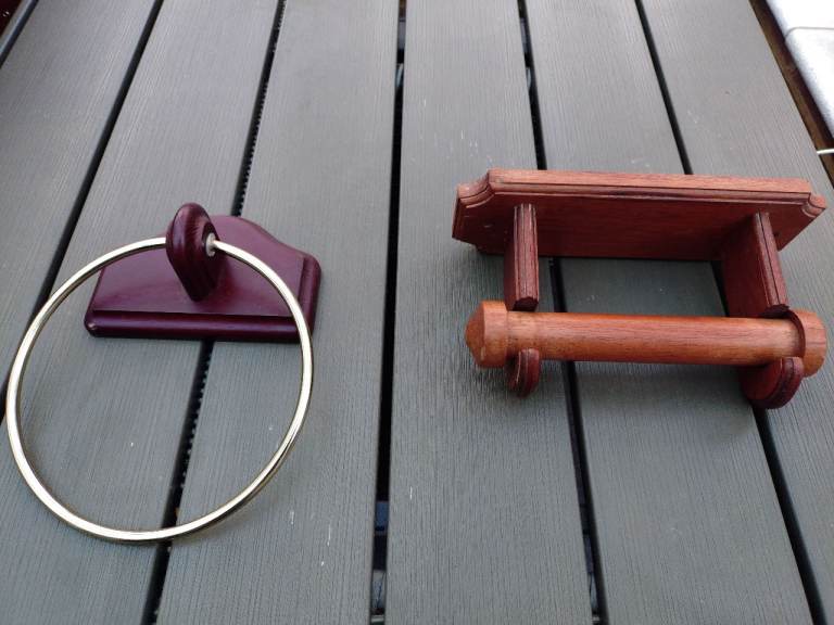 The toilet roll holder is of wood but not matching. Please see photos.