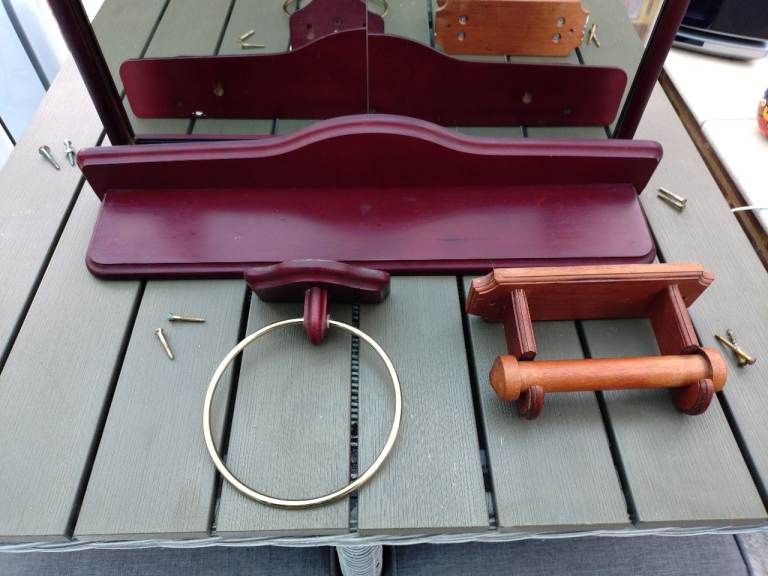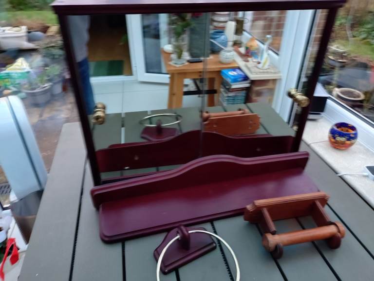 Wooden Bathroom set comprising of matching cabinet, shelf and Towel Holder.