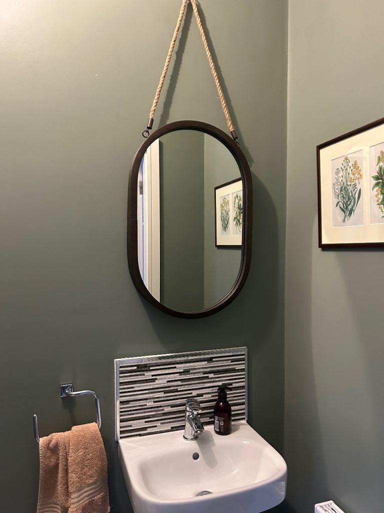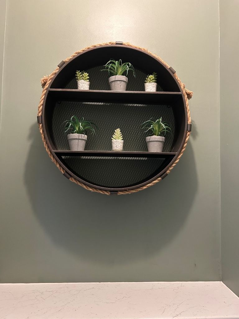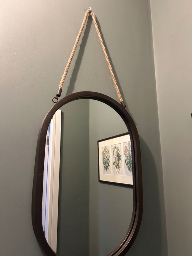 Matching bathroom mirror and shelving unit. Good condition. Metal and rope materials. Shelving until also has the hanging rope seen on the mirror, we just haven’t used it.