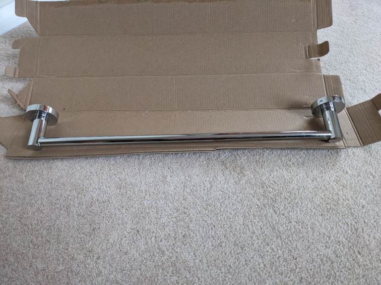 Matching chrome towel rail and toilet roll holder. Unused and with boxes. The toilet roll holder comes with screws and Allen key. There are no screws for the towel rail.