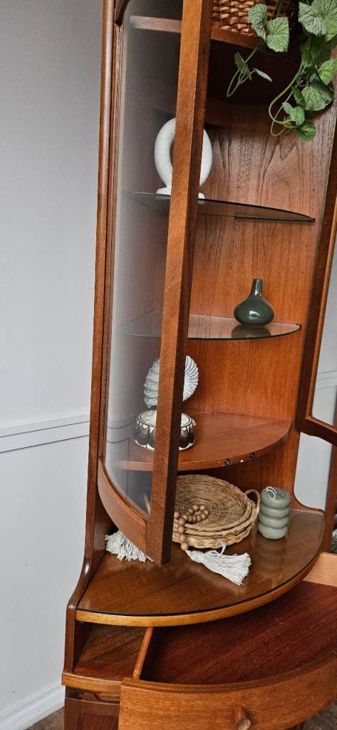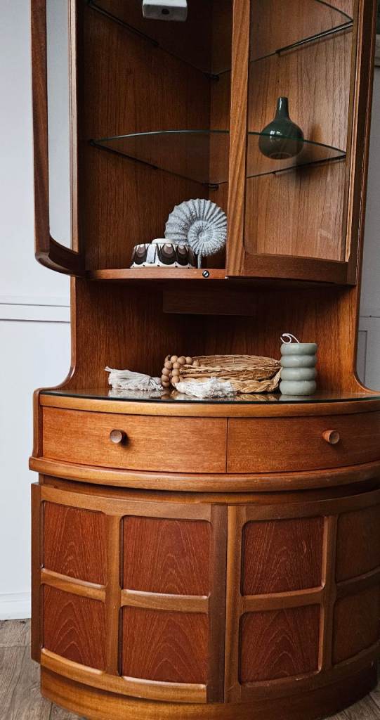 Features the signature Nathan geometric panelled doors on the lower cupboard and elegantly curved glass doors on the upper display section, exuding a classic 1960s-70s Scandinavian-inspired aesthetic.