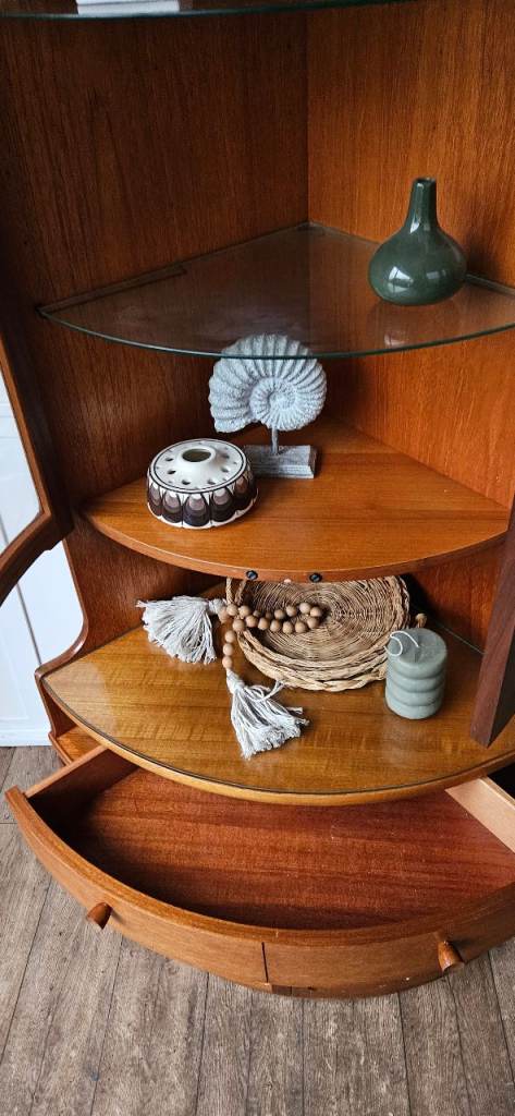 This beautifully crafted vintage mid-century modern teak corner cabinet, from the renowned British furniture maker Nathan Furniture's iconic "Squares" range, offers both style and practicality. With its distinctive design and warm, rich teak grain, this piece is the perfect solution for maximizing space in any living area, dining room, or home office.