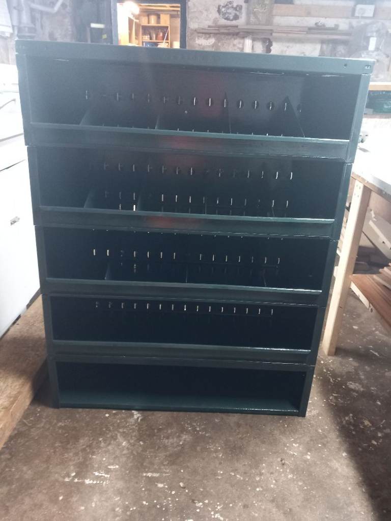 Heavy Duty Steel Pidgeon hole storage unit . Height 3ft 10 inch. Width 3ft. Depth 1 ft. Fully refurbished with two coats of Hammerite Smooth Green paint. Buyer collects. Can be dismantled into sections for easy transport.