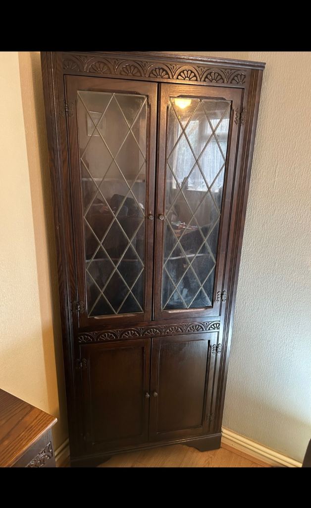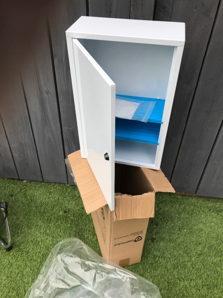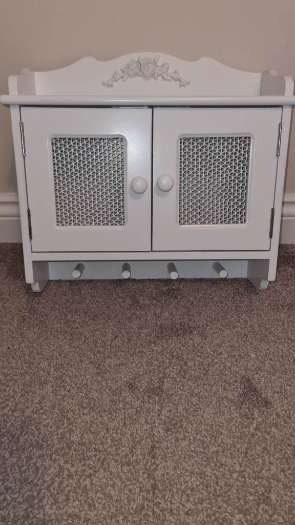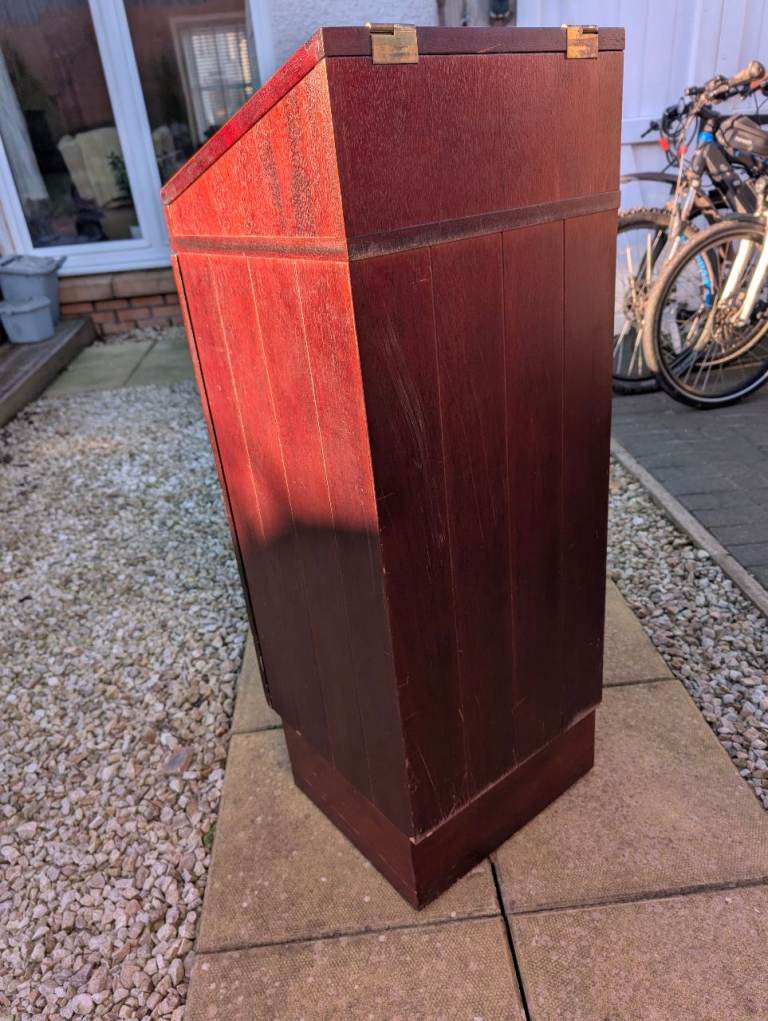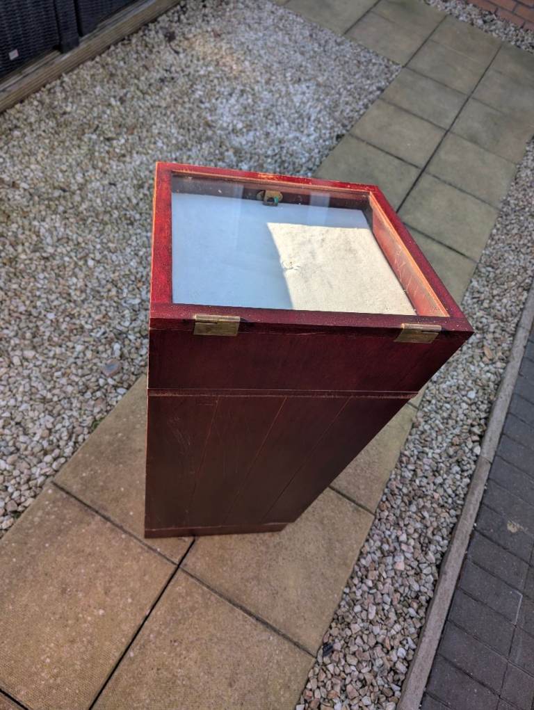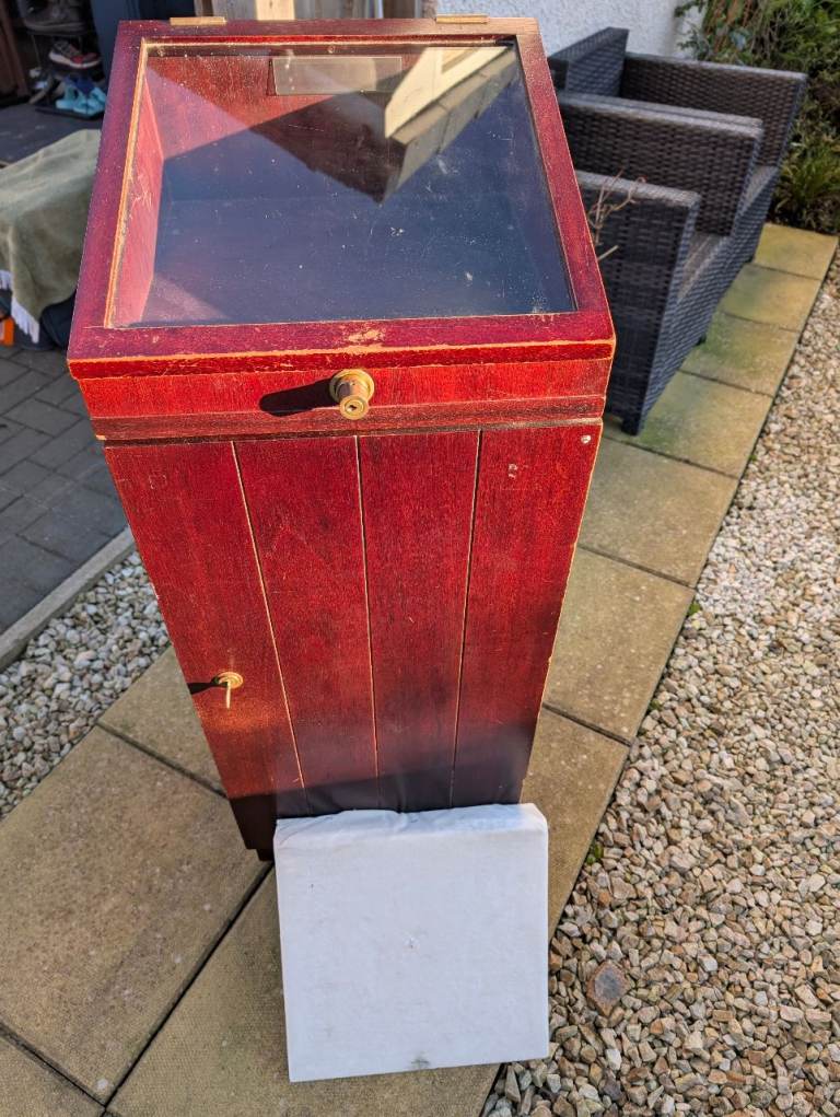 Jewellery or tools storage cabinet with 5 draws. Lockable cabinet and glass lid. Removable padded display shelf. Requires tlc.