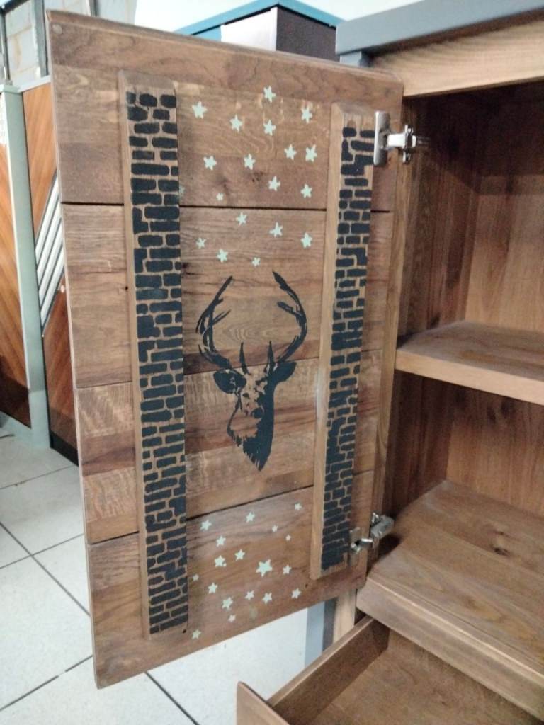 It has an excellent amount of storage space and features a trendy stag and star motif on the inner cabinet door.