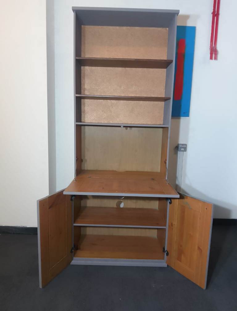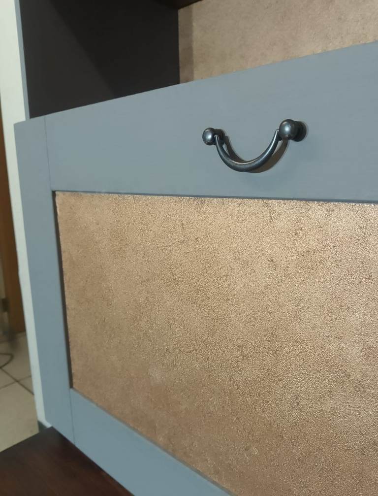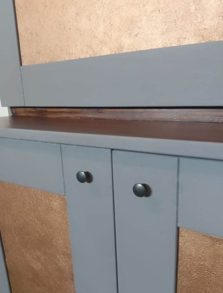 Newly upcycled stunning tall Cabinet in grey with metallic bronze paper lining. This solid lovely unit comes with a pulldown spacious compartment.