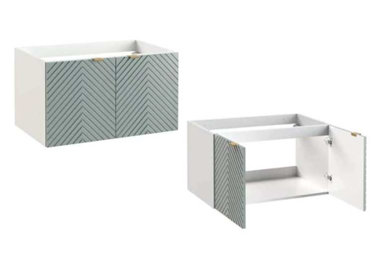 Green 800mm bathroom vanity unit, wall mounted floating bathroom cabinet with two doors in trending finish. The unit has modern Textured Fluted Ribbed fronts and slim gold colour grab handles included as standard.