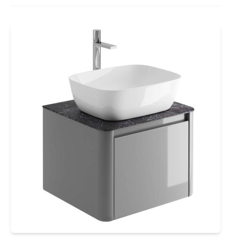 “Sleek & sophisticated, the Callerton vanity unit is highly desirable, featuring a smooth light grey gloss finish which is complimented beautifully by an elegant slate worktop crafted from porcelain tile. The worktop has pre-drilled holes for a tap and waste. This stunning