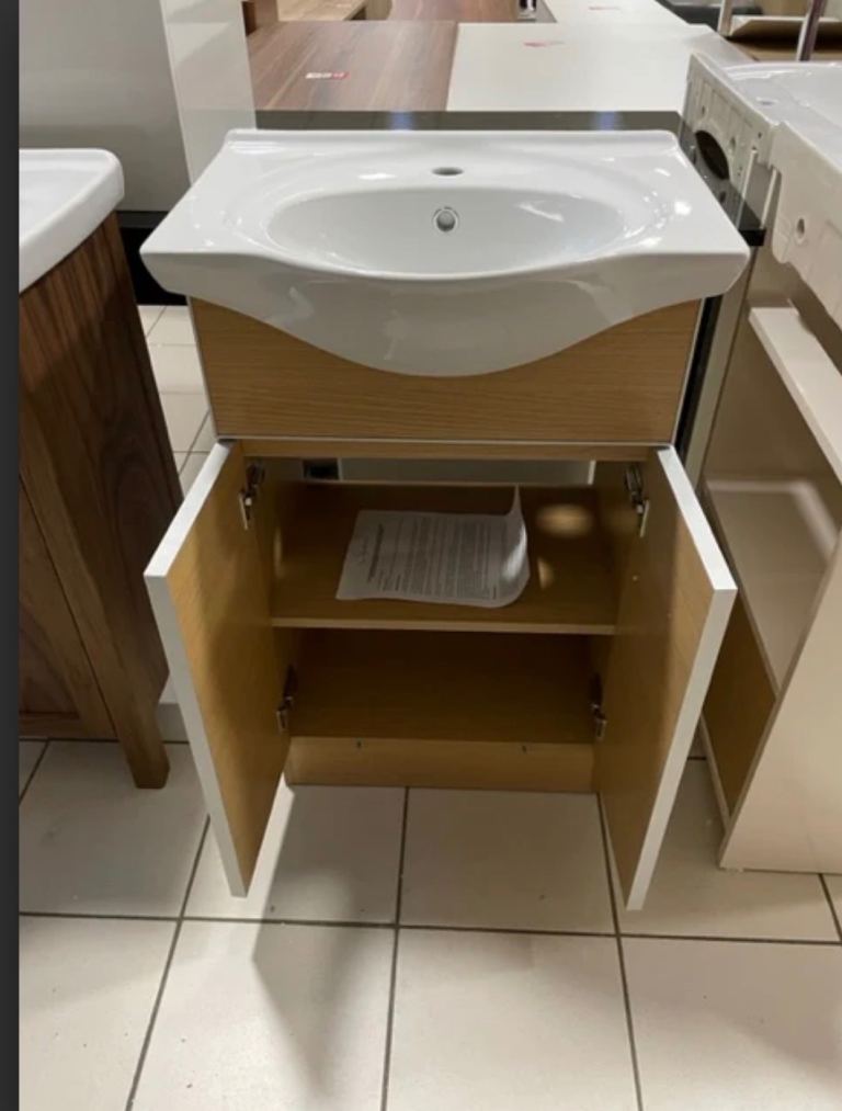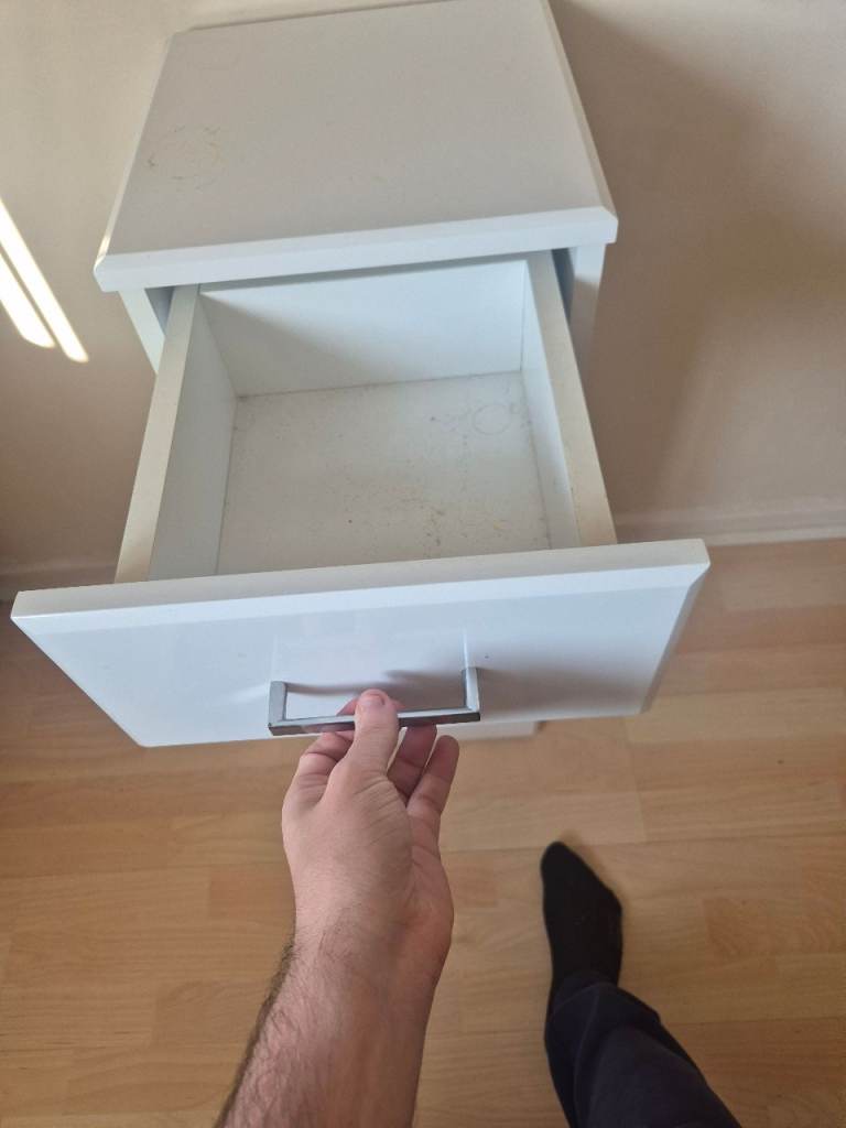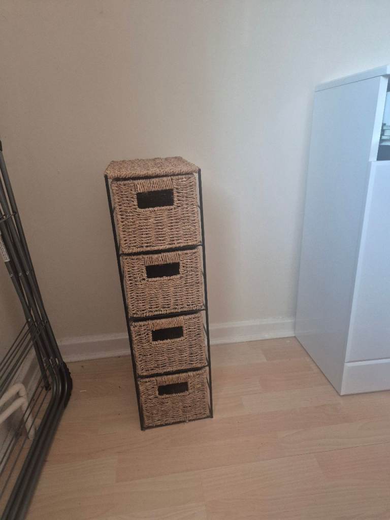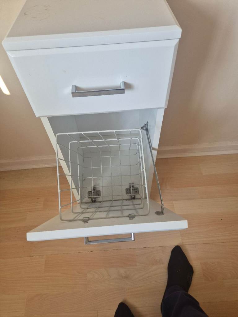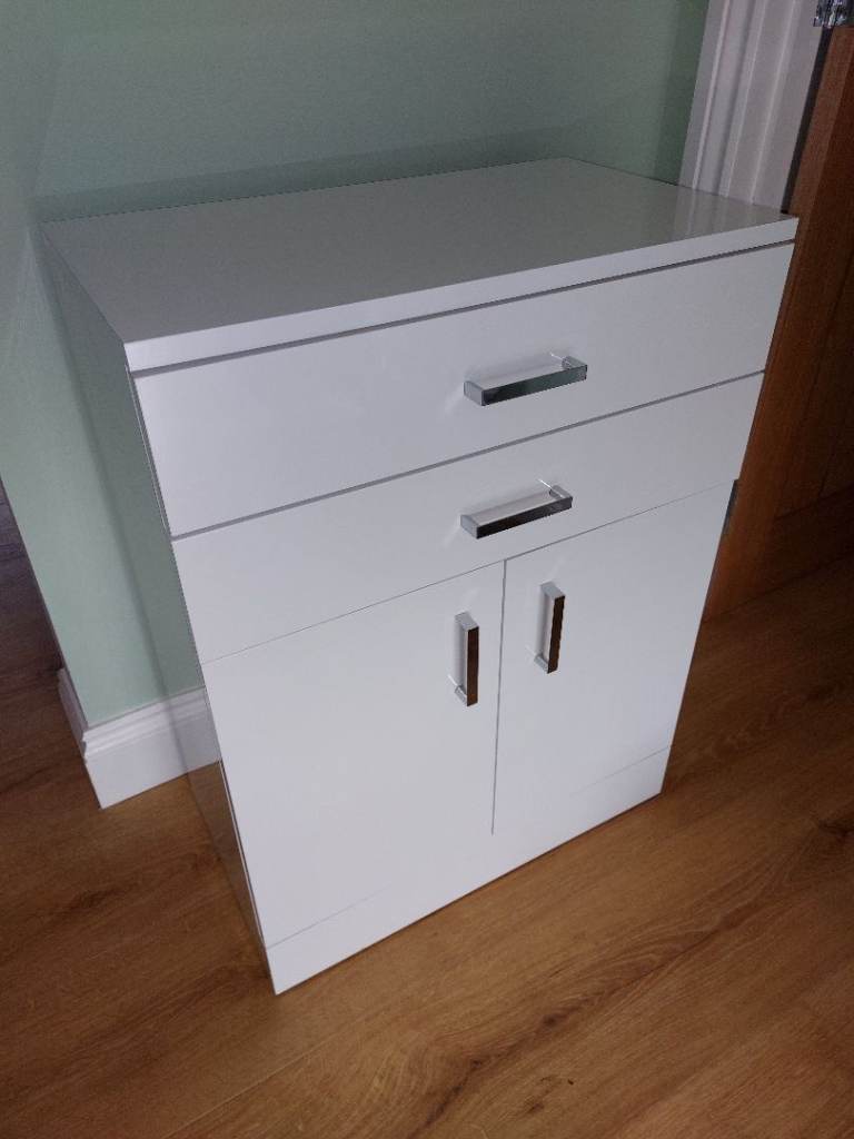This unit is a gloss white bathroom laundry basket cabinet, a functional piece designed to hide laundry while providing extra storage. It typically features a top drawer for smaller items and a tilt-out bottom cupboard that houses a removable laundry basket. Cash on collection