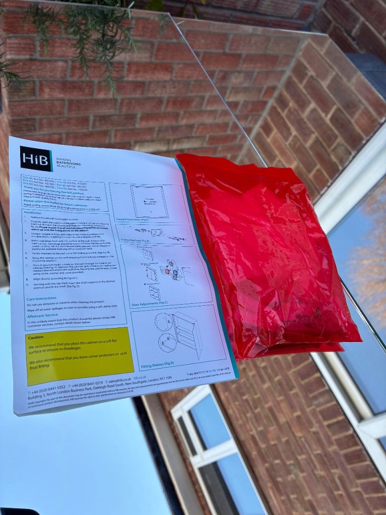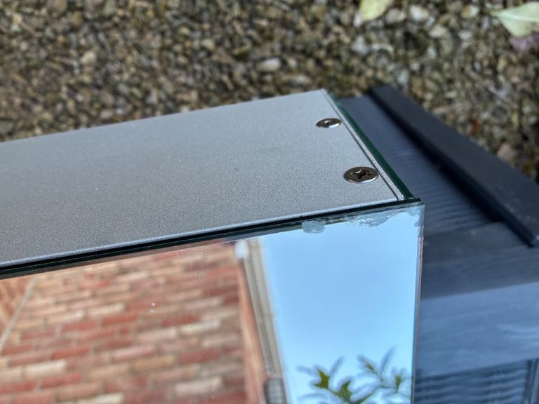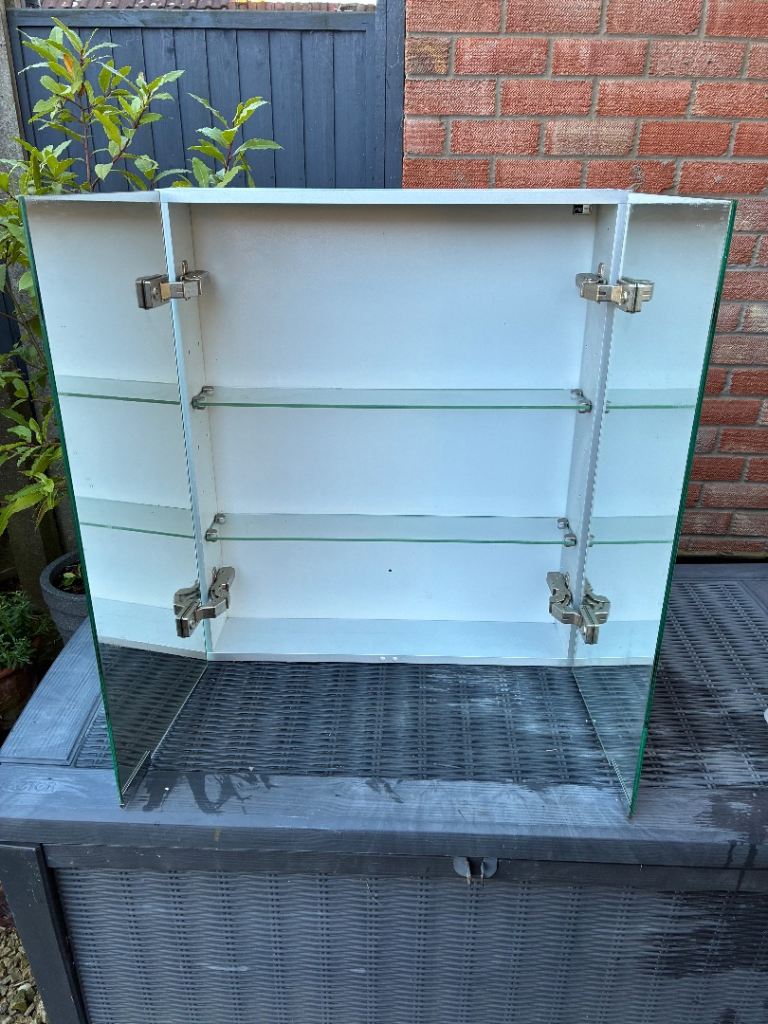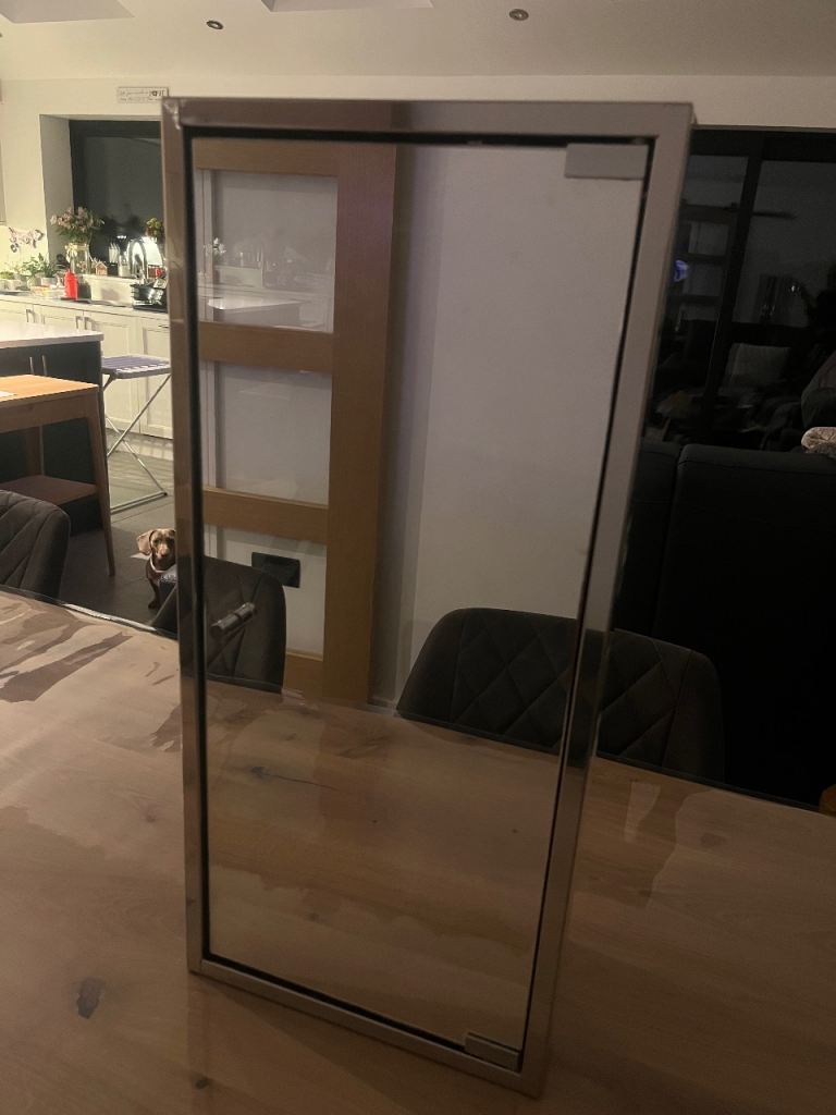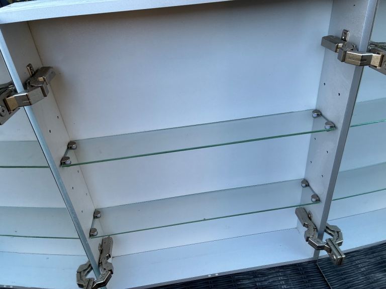 High end cabinet as pictured in its original box with fittings. Has been used for a few years and therefore has signs of degrade to the edges of the glass, however this is only in certain places all of which I have highlighted in the images. Still looks great and comes with a brand new fixing pack too and instructions. Cost £500 new so is a bargain at the price.