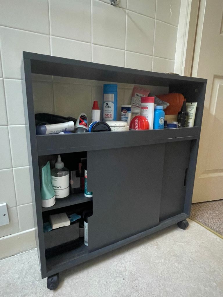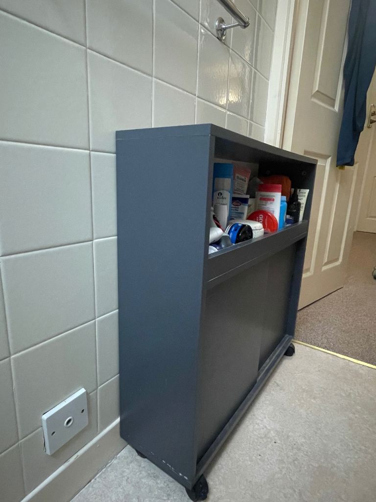 Selling a narrow bathroom or kitchen shelf on wheels, with two sliding doors. Intended to fit into niche and be pulled out, but we used it as a normal cupboard in our small bathroom. Darkgrey, made from MDF I think.