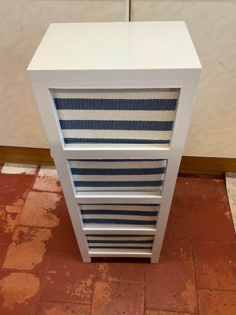 This lovely slim cabinet with 4 draws is 70 cm tall, 19 cm wide and 26.5 cm deep.