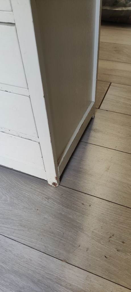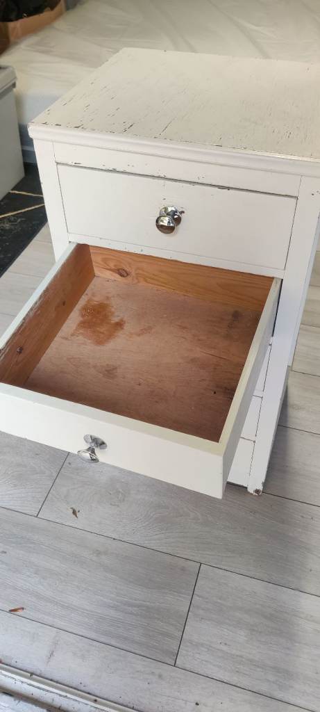 As pictured, drawers are all in good working order but the item itself could use repainting. Some light staining to the inside of the drawers, purely superficial.