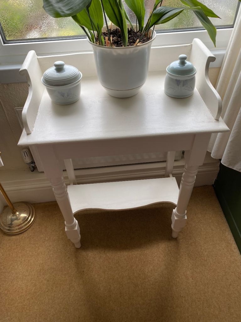 Old pine wash stand. Painted white satin. Measurements 24” wide. 16” deep. 28” front tall. 31” back tall.