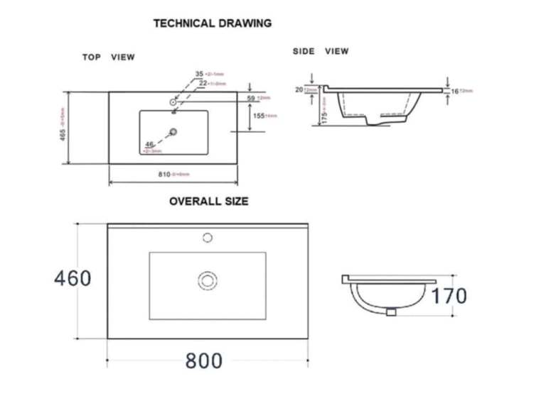 Sink Size: 17 cm (H) x 80 cm (W) x 46 cm (D)