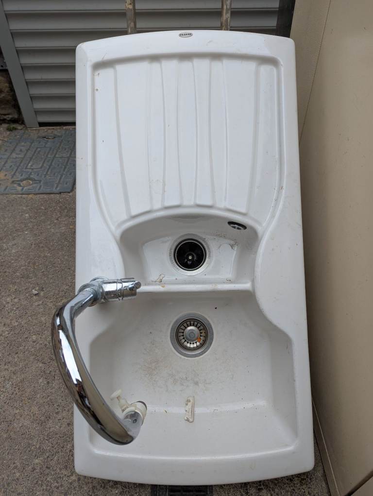 Removed to make way for a 2.0 bowl sink. Lots of life left in this, small chip on the side between the two bowls. Insinkerator in full working order attached to the half bowl, can be removed if not required.