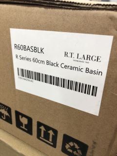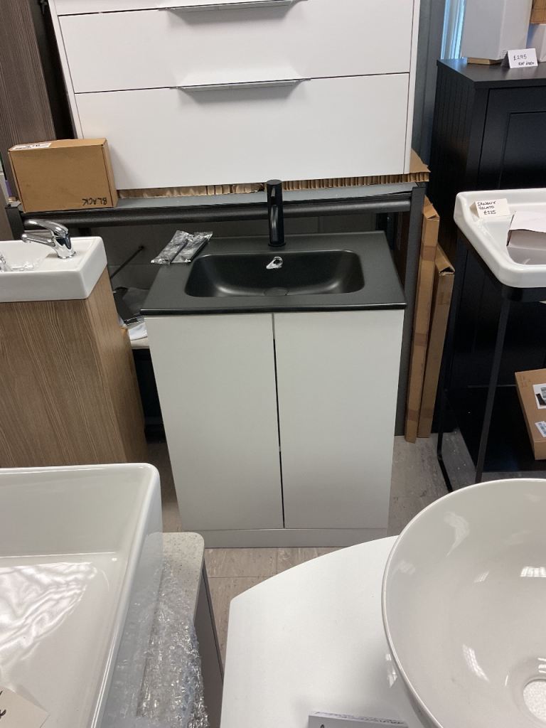 Floorstanding satin white vanity 609x460mm complete with black ceramic basin, black mixer and waste, overflow and handles.