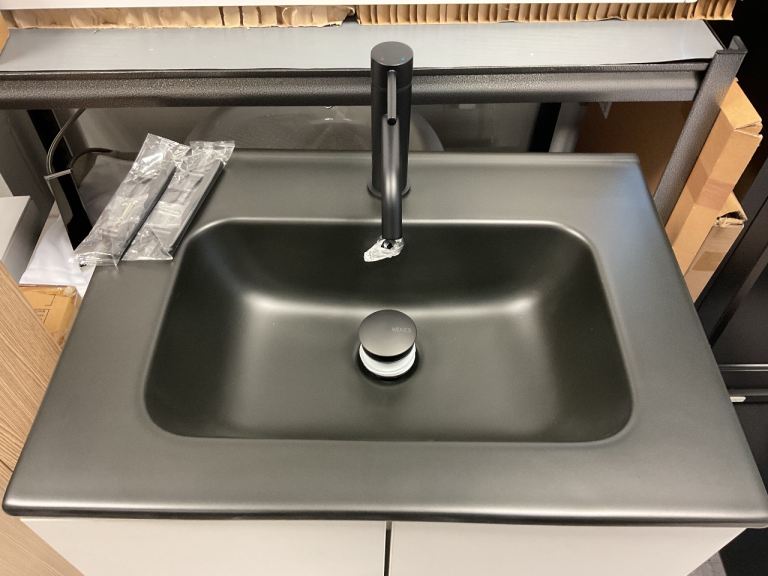 Satin white freestanding vanity, 600x460, black basin, mixer, waste & handles