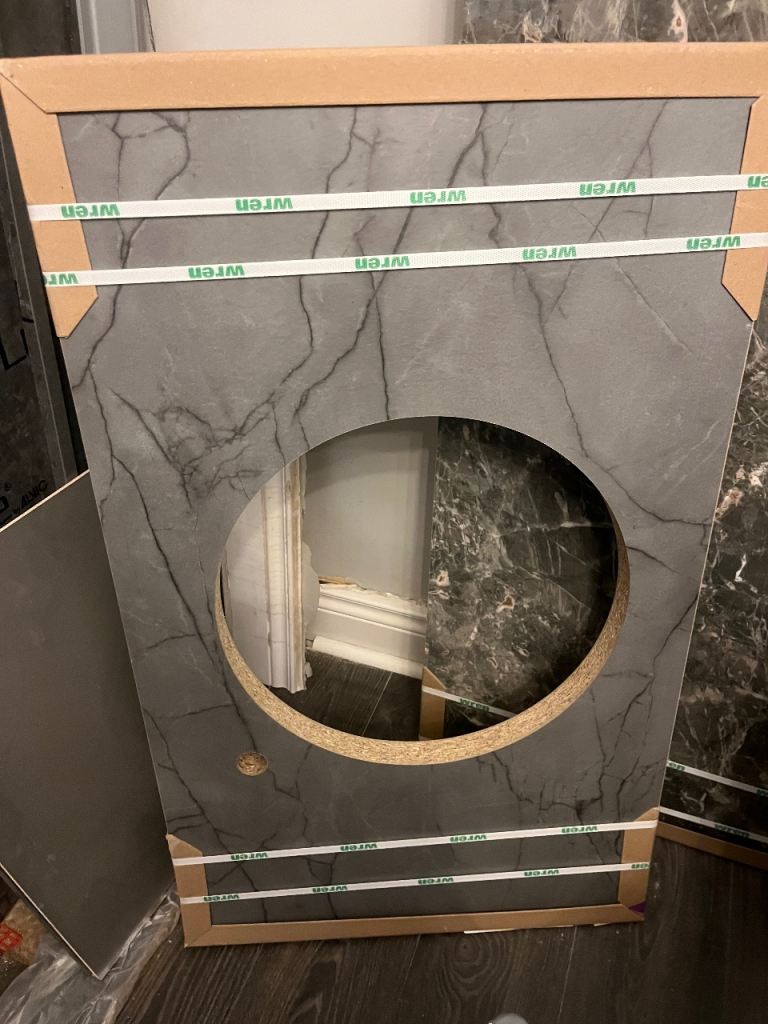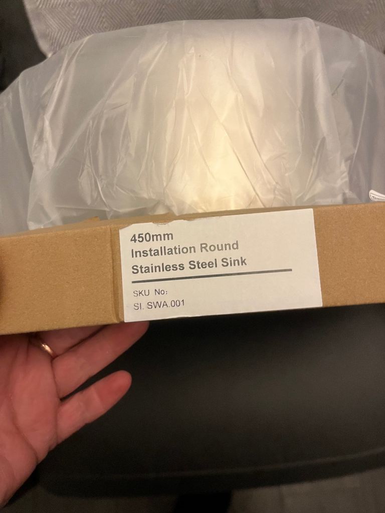 Never used in original packaging. Sink stainless steel round bowl. Chrome tap also. Pre cut templated worktop bay for sink to sit in approx 1m x 60cm dark grey marble effect wooden surface. £85 cash on collection only! Buyer uplifts