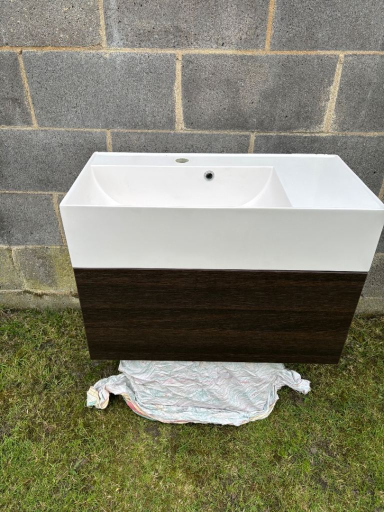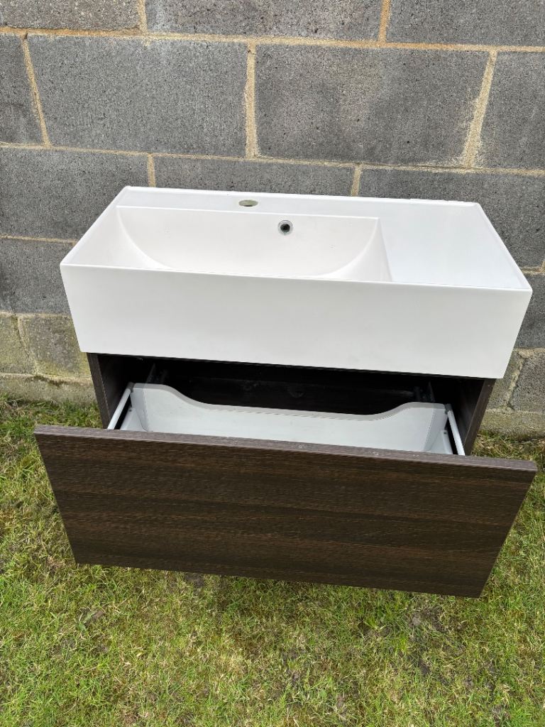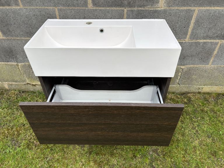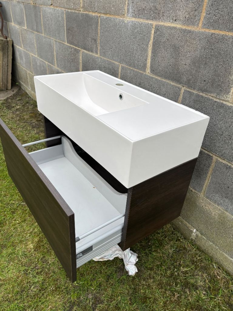 Wall hung bathroom sink and drawer unit ,sink is made of a hard plastic composite in used condition slight crack at front edge but doesn’t cause any problems or leaking look at pictures hence £40 Offers .Collection only .price is mainly for drawer unit