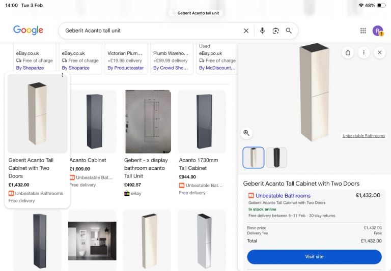 GEBERIT Acanto tall bathroom unit with pill lock drawer. This unit was advertised at £1500 and now selling for £1,000