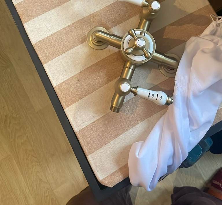 Nevis Brushed Brass Traditional Thermostatic Shower Set with Hand Shower. Bought for our bathroom renovation but never used. One spoke of the temperature dial has fallen off (screw snapped) but should be easily repairable - hence large discount. Otherwise perfect condition. RRP £299.99