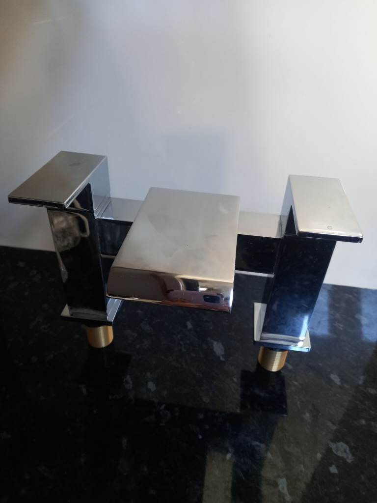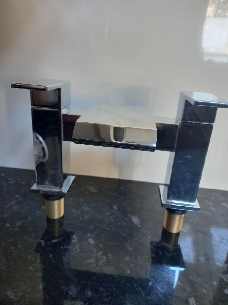 Cascade unused chrome polished modern bath mixer tap 18cm centre hot and cold inlet. It comes with polished chrome waste spring loaded, 4 cm diameter and 3.8 cm thread height. Universal, so they will fit any baths.