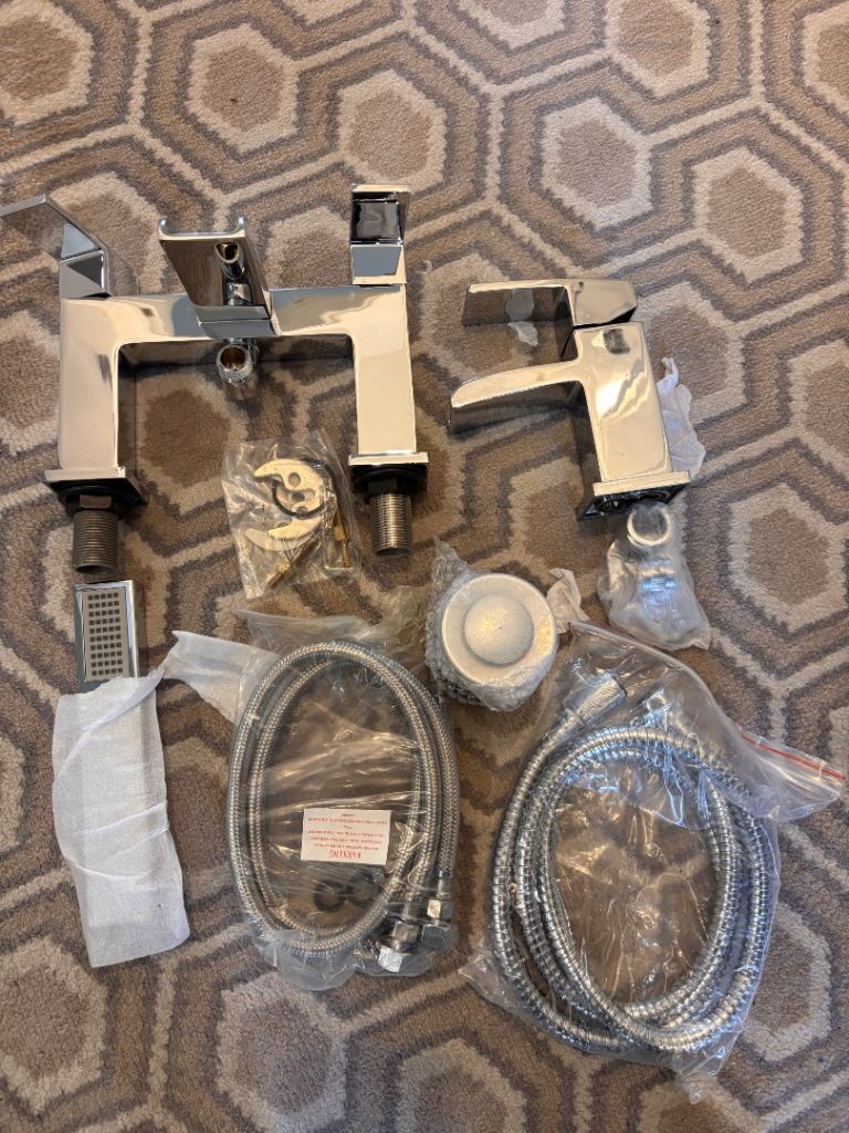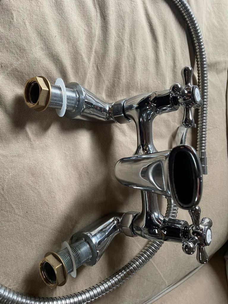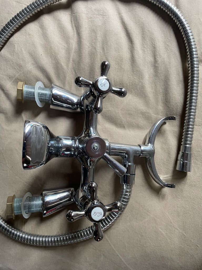 Victorian style chrome bath/shower mixer tap. Full turn taps, new seals, fixings, needs a shower head which are readily available from Amazon/b&q