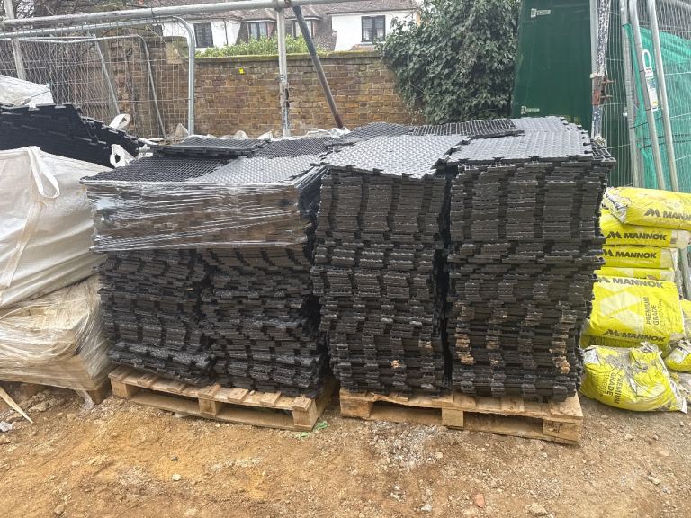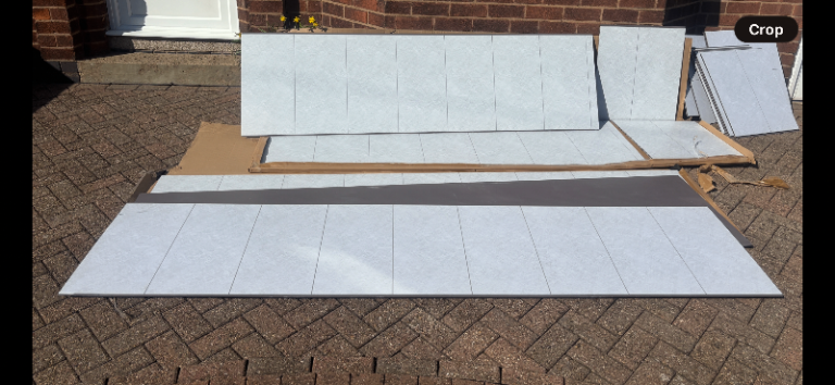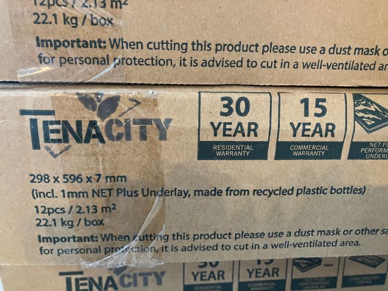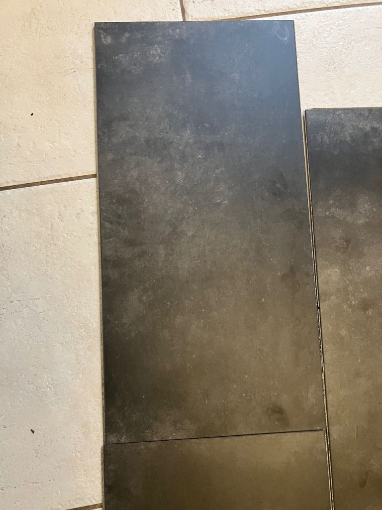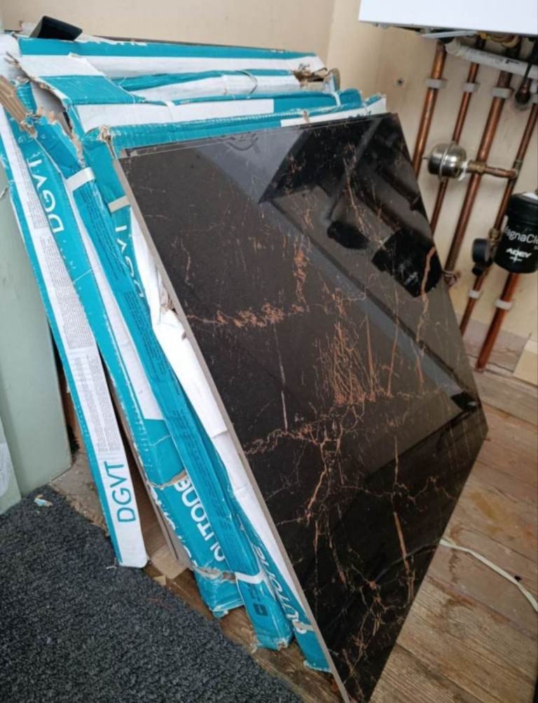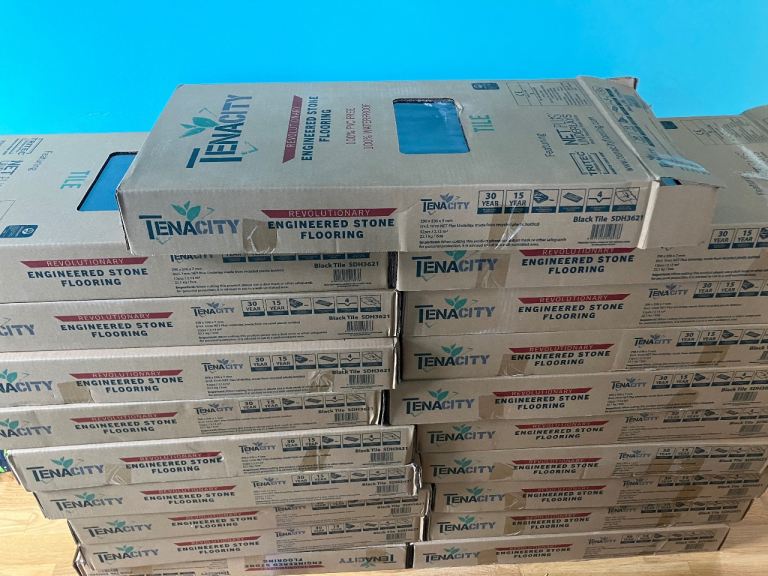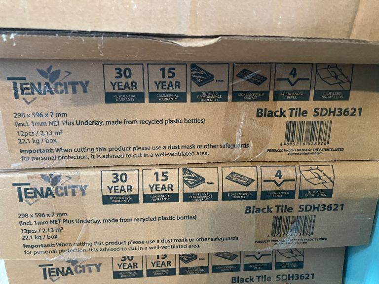 Engineered stone black flooring. 100% waterproof with glueless installation. Tile size 298 x 596 x 7mm. Box size is 2.13m square. £15 a box have 28 boxes in total.