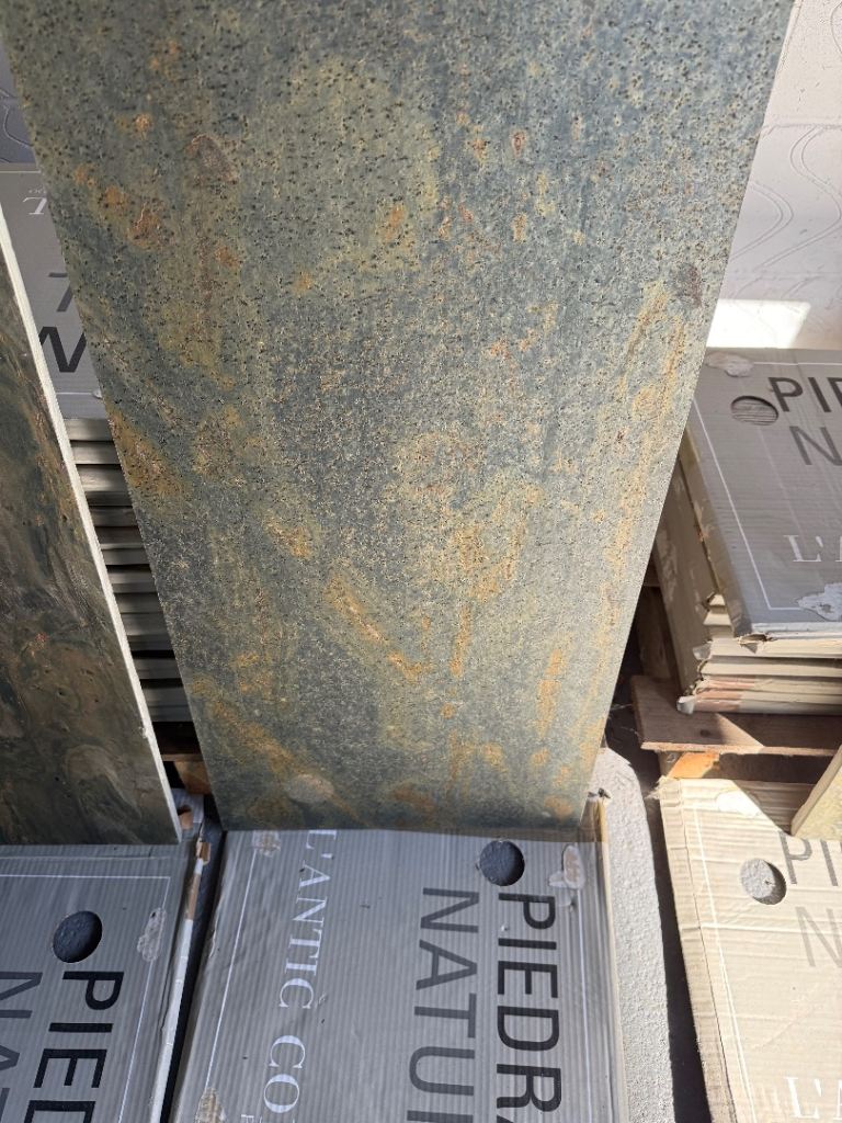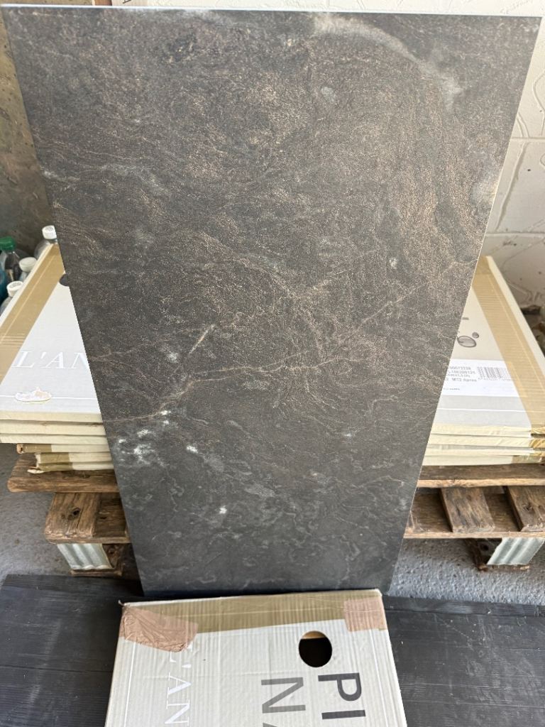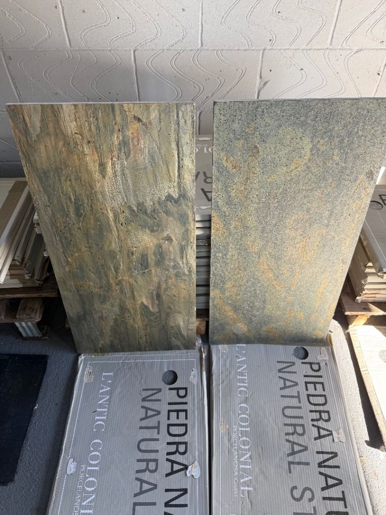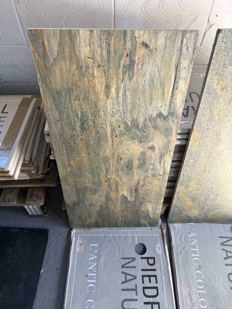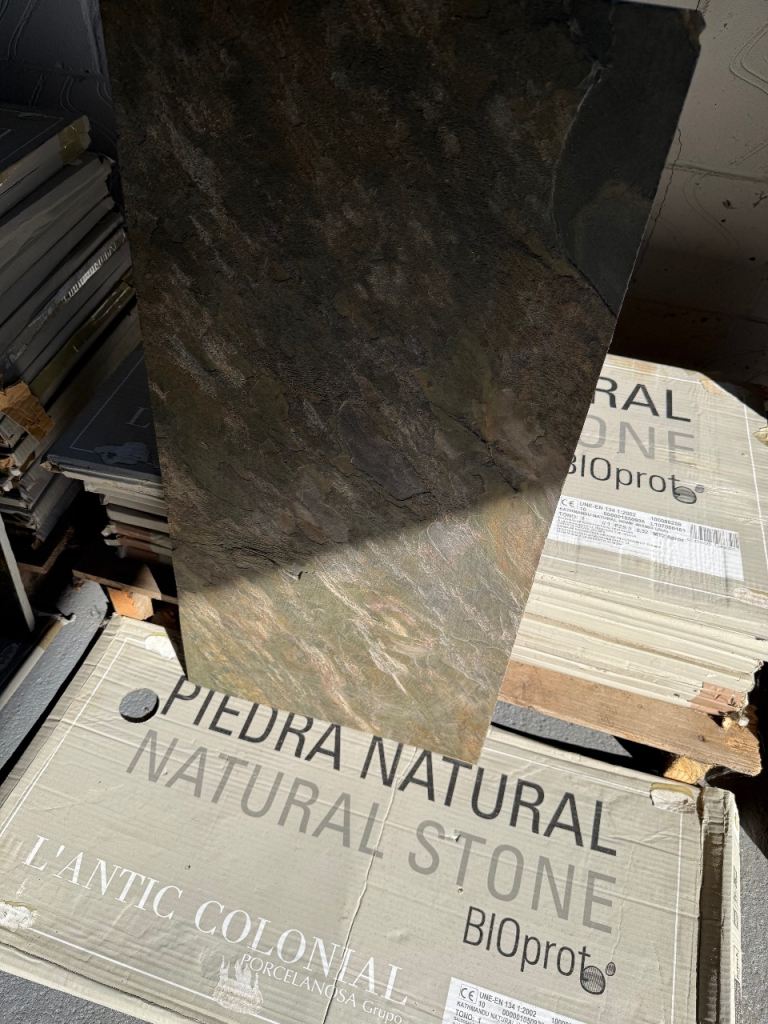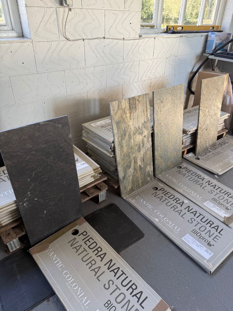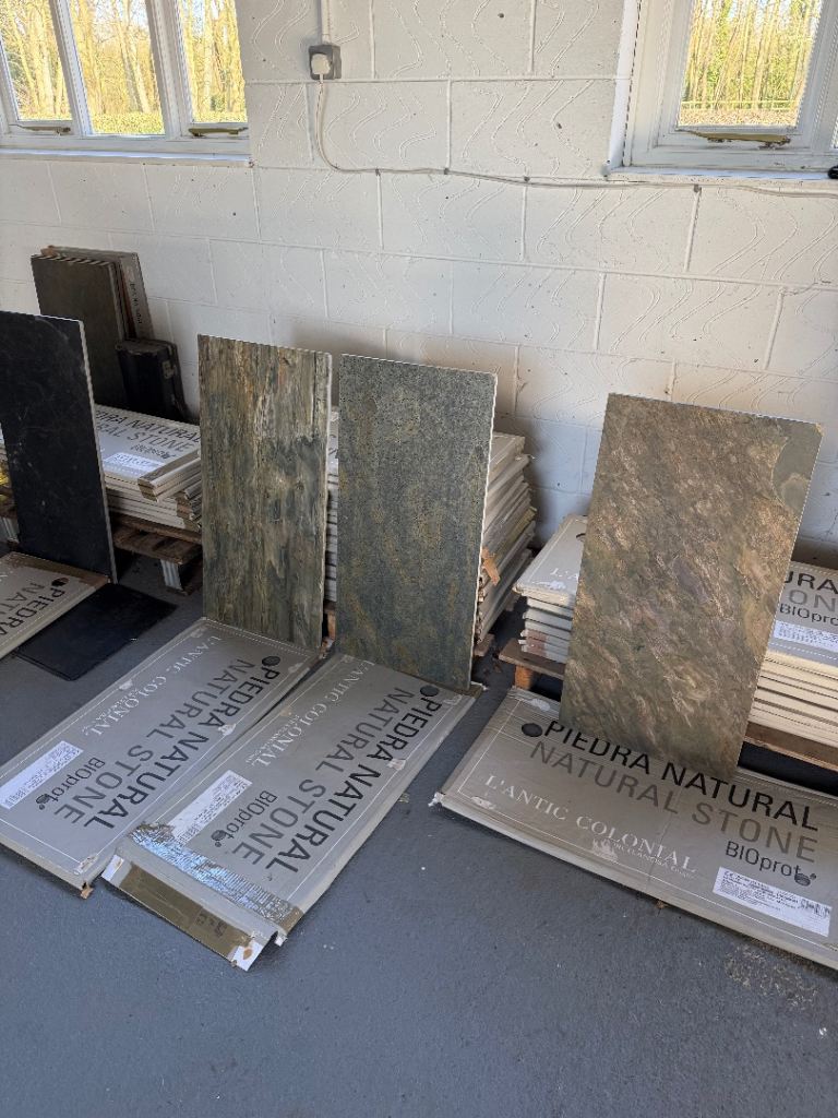 Free to collect the above tiles which were surplus. They are all different but thats how it's meant to be I believe. They are great for under Woodburners (as shown in last photo) or indeed on walls behind wood burners. All tiles are indoors and all are wall some maybe floor, not too sure.There are 45 tiles in total. The black slate has 11, there are 23 of green/gold in middle and 11 on right of picture with all tiles. Never been used and stored flat. Dimensions are on labels.