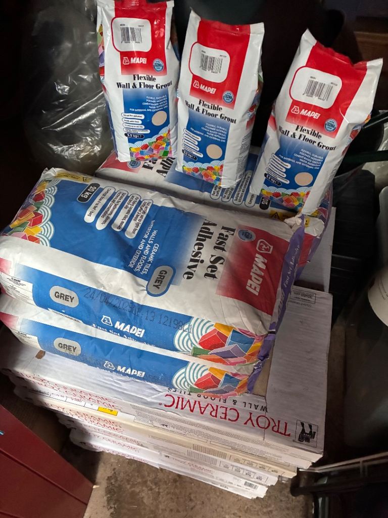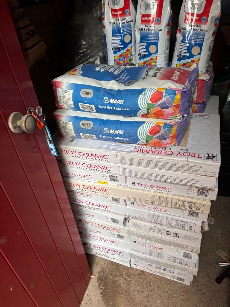 27x boxes of Troy ceramic tiles 30x60cm look amazing down. 3 x mapai cream grout 4 x bags of adhesive. All £300 Approximately 30sqm