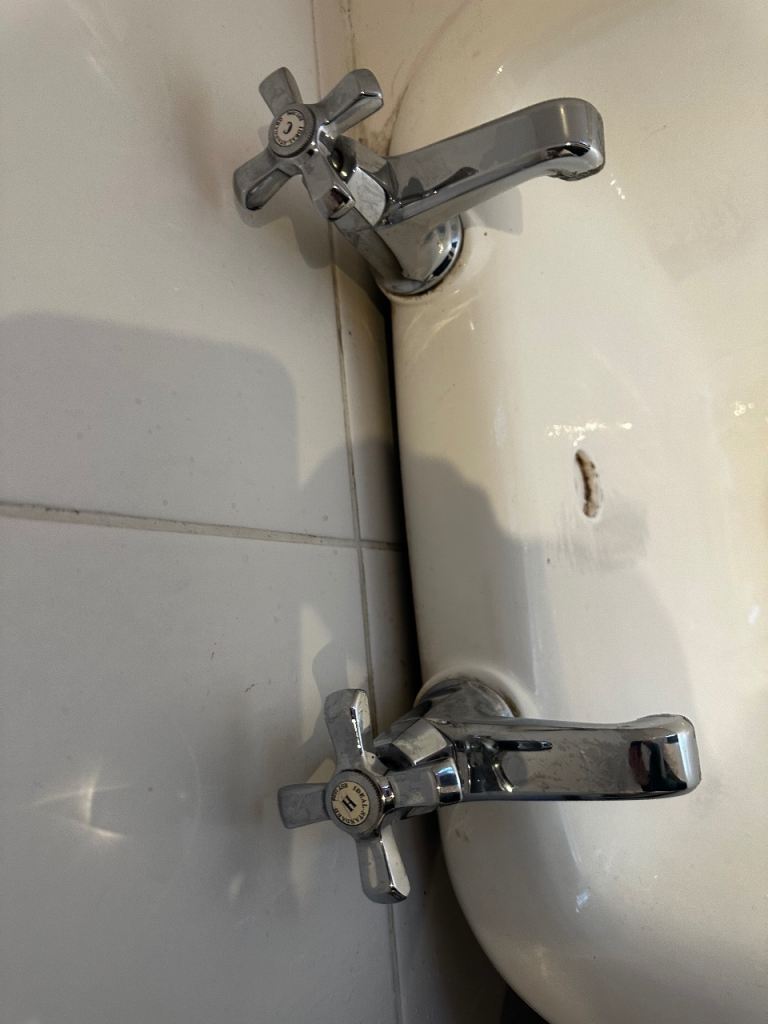 Offers excellent potential for refurbishment. In very good condition aside from a patch at the back of the bath and around the plug hole (see picture). Either spot repairing or re-enamelling the whole bath; this bath could easily be made into a contemporary statement piece in the right bathroom. Also comes with two free Victorian style taps in excellent condition. Feet detachable for transit. Measures 183cm length, 77cm width tapering to 58cm and 57cm height. Buyer to collect. Available in the next few weeks for collection. (See also listing for similar styled basin if matching style required- both for £90 total)