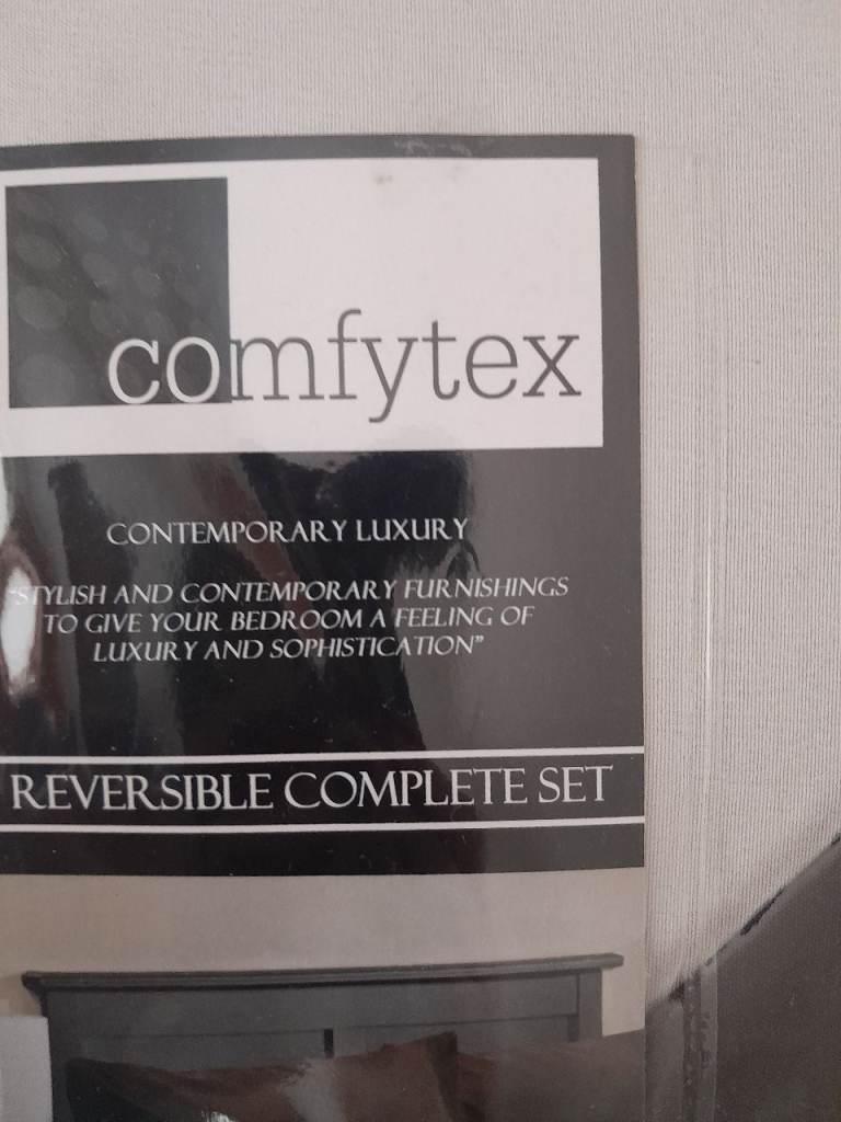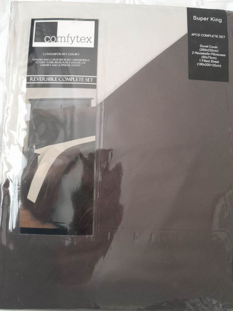 Complete new unopened 4 piece reversible duvet set. Brown/ cream