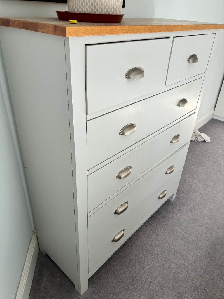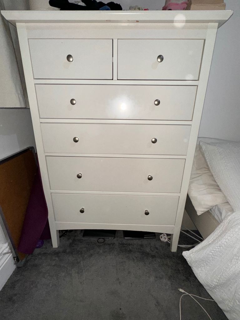 Moving flat and selling our beautiful Chest of Drawers pebble gay with 2 small drawers + 4 larger drawers. It’s a sturdy unit that holds a lot of clothes but looks very nice in a bedroom. Super high quality!