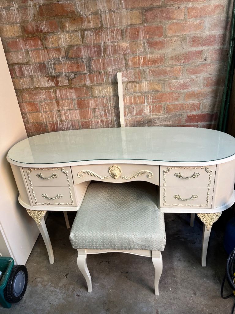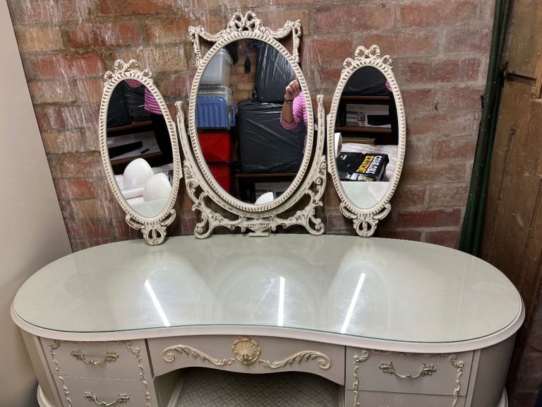Kidney shaped dressing table with glass top and 5 draws. Also triple movable mirrors.