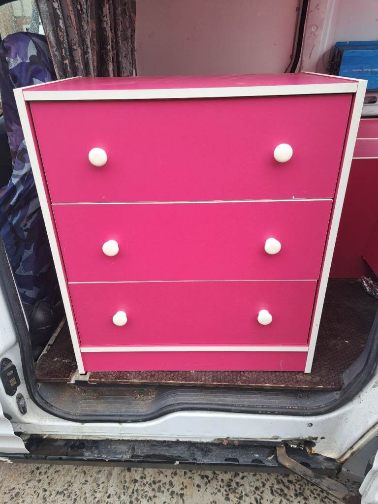 pink bedroom furniture 2 door wardrobe ,3 drawer chest of drawers and a 1 drawer bedside cabinet all in good condition please ring or text me for more details please take a look at my other items thanks no offers