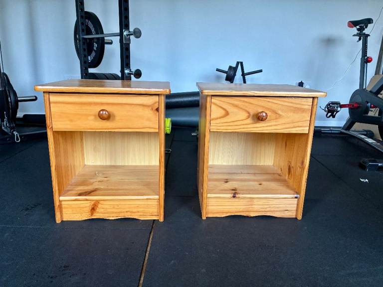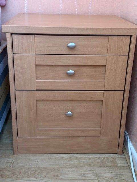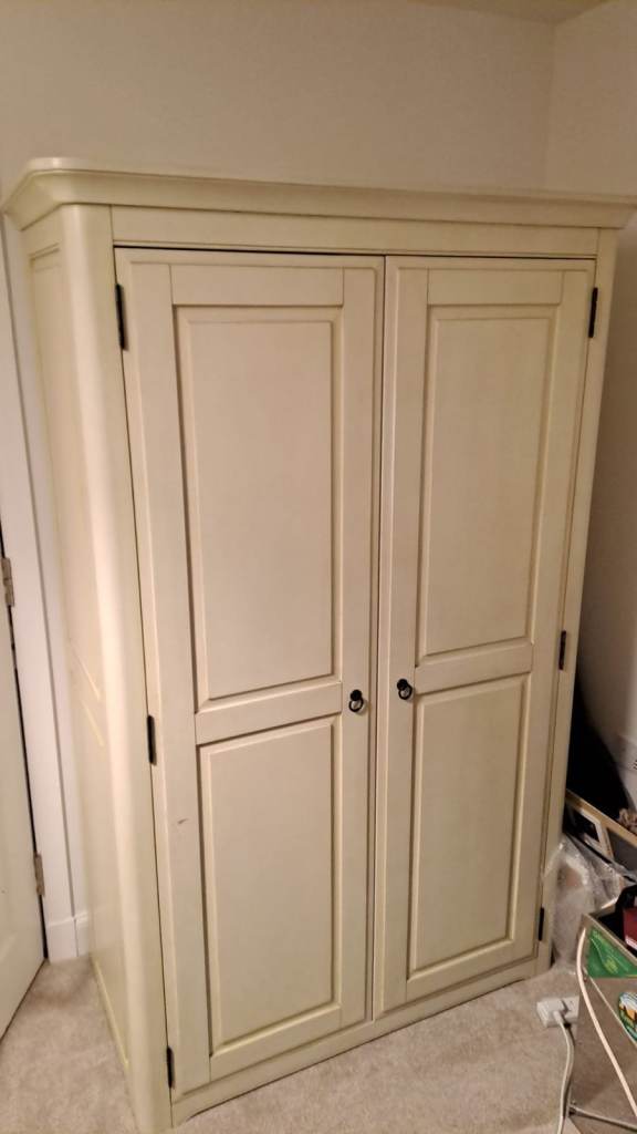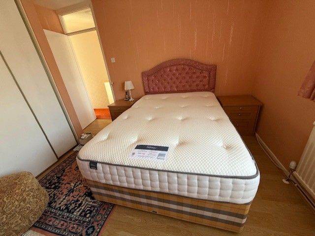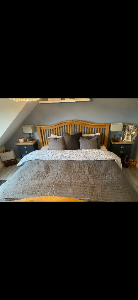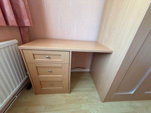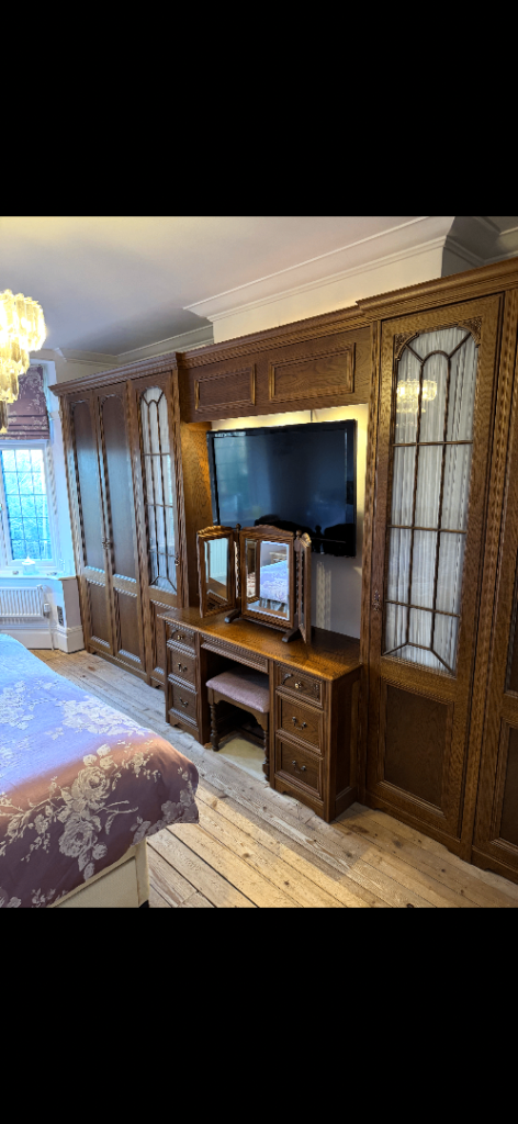 Comprises double 4 door wardrobe (one of which has drawers inside), attached dressing table and 2 bedside cabinets.