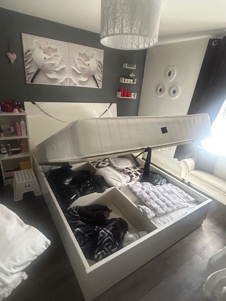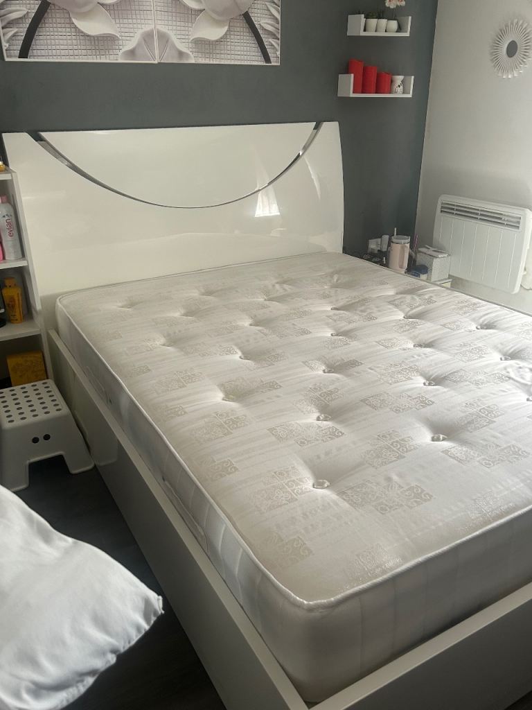 King size White Glossy Ottoman bed with plenty of room for storing things. Good condition. Easy to use, sturdy, and perfect for keeping your bedroom tidy. Comes with mattress which is in good condition.