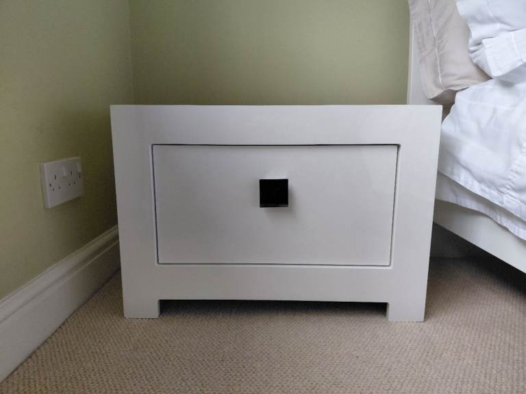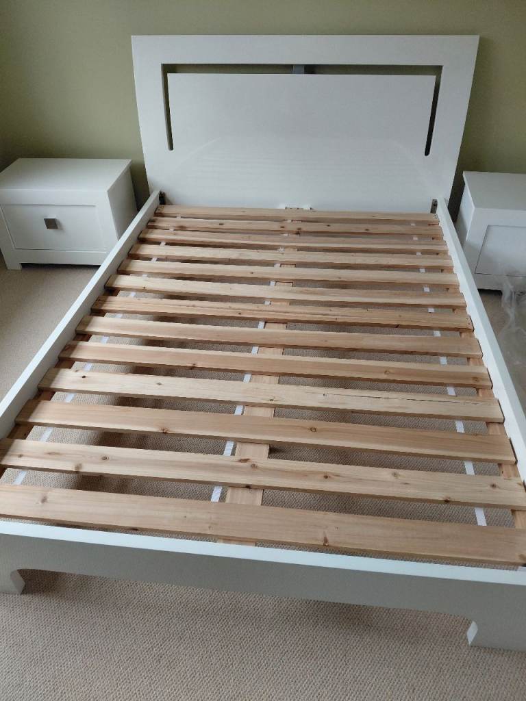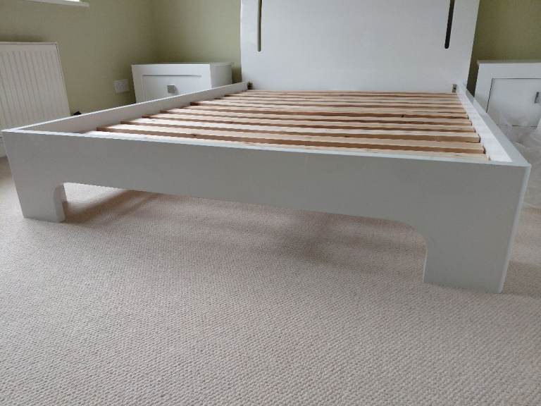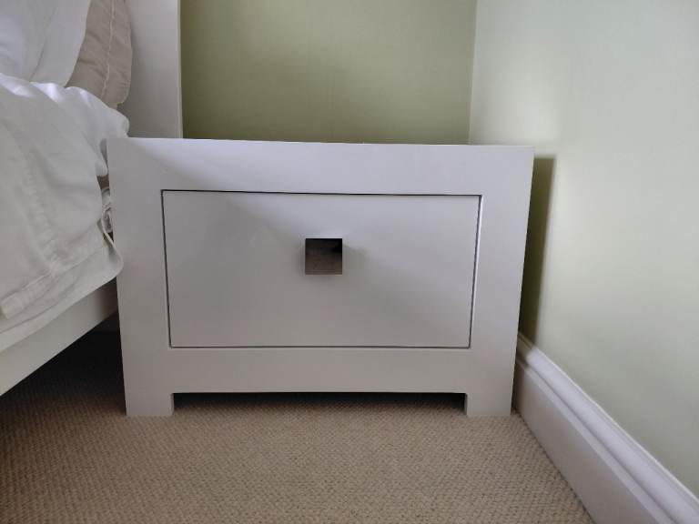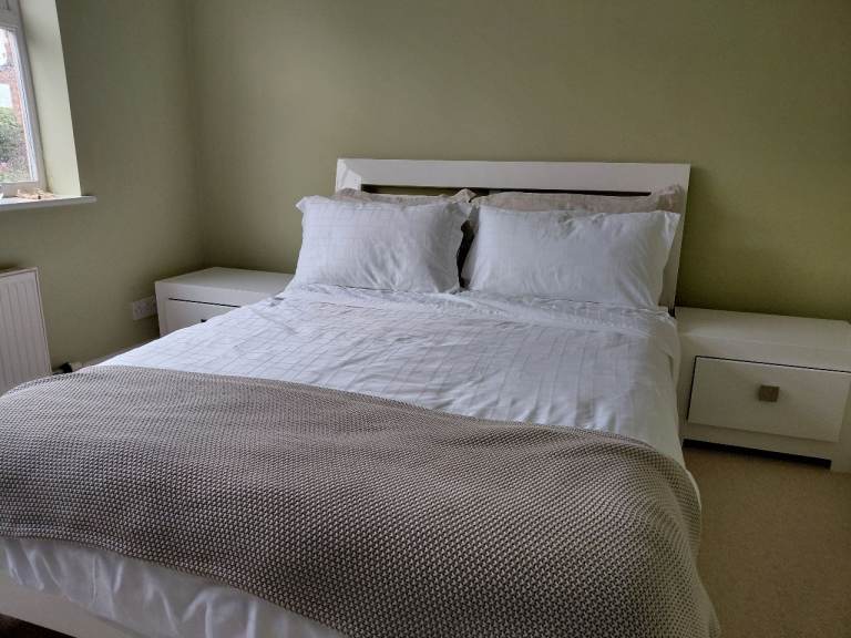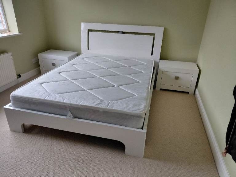 White sleek modern double bed frame and pair of chest of drawers with free mattress