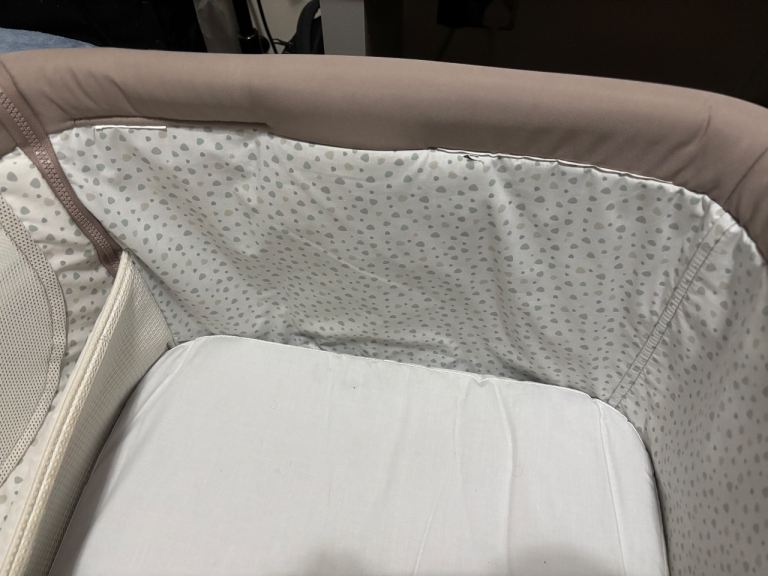 A used Chicco bedside crib. Has a few cuts where labels have been cut off and some stains. Can be unzipped and washed