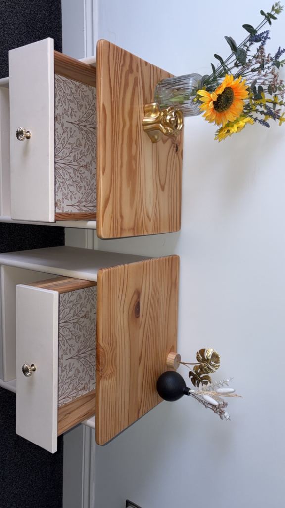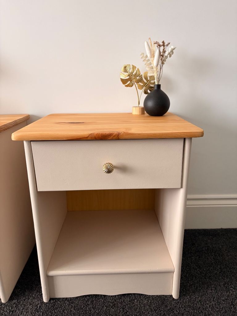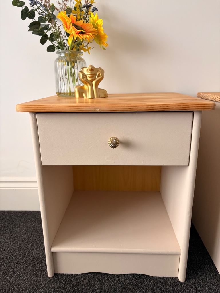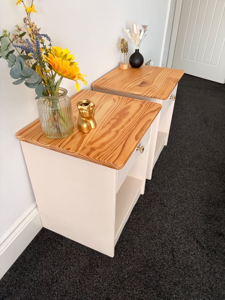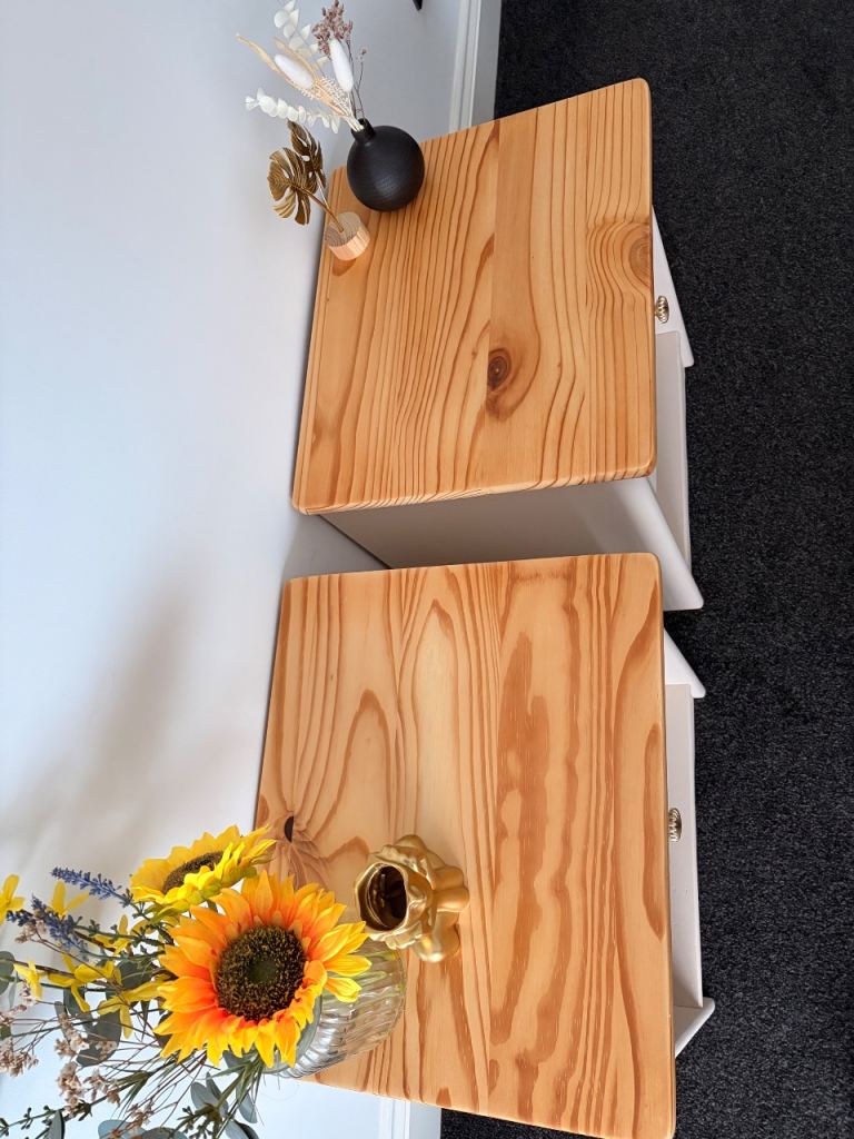 🌟 Beautiful recently refurbished solid pine bedside tables. Beeswax finish to prevent water marks. Golden handles and quirky flower contact paper in draws. Can easily be removed if preferred. Can deliver locally within 5 mile for free. Open to offers. Message for dimensions