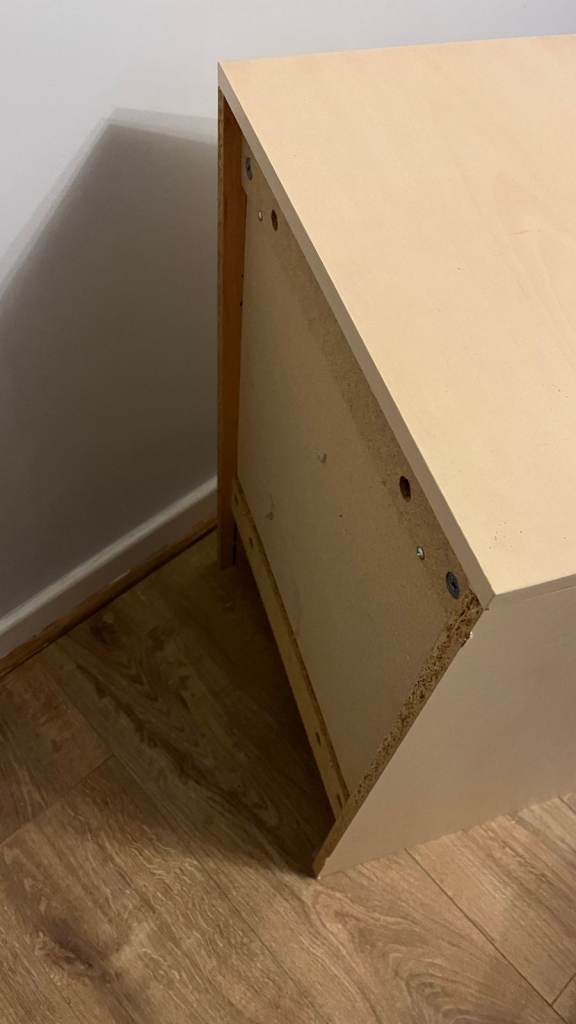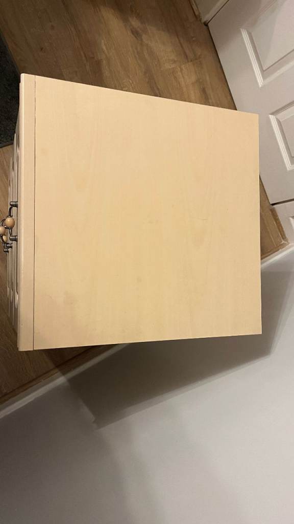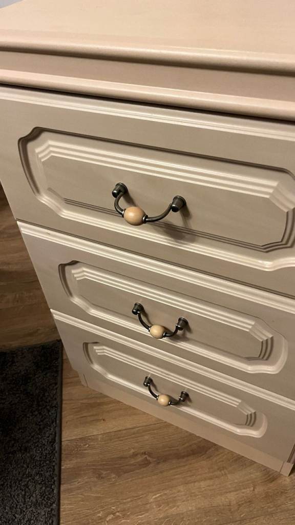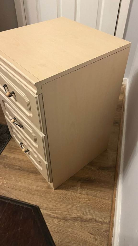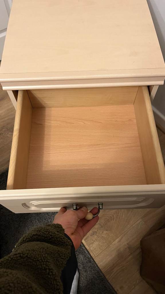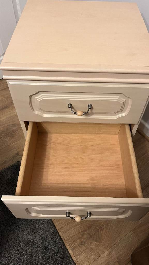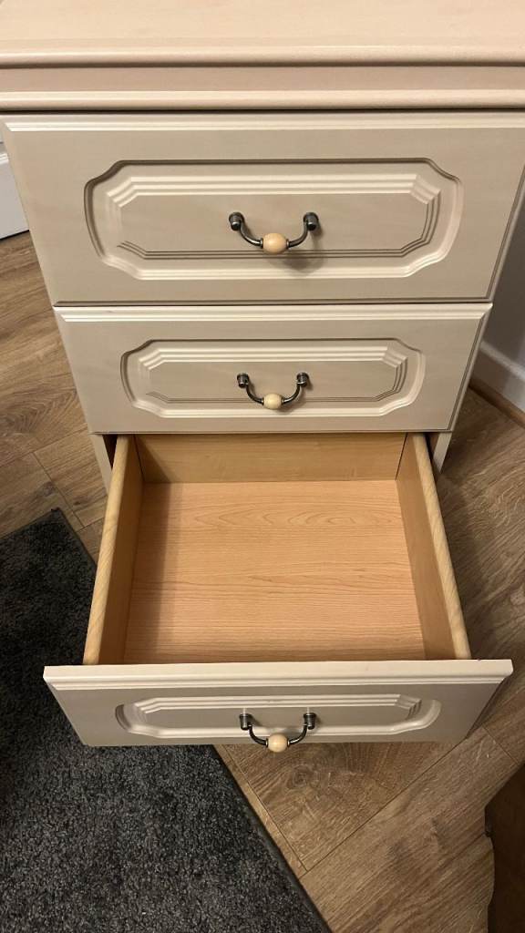 Good quality, large bedside cabinet. It's in very good condition. No marks, scratches or damage. The drawers all run nicely and are clean too. The colour is an off white / cream.