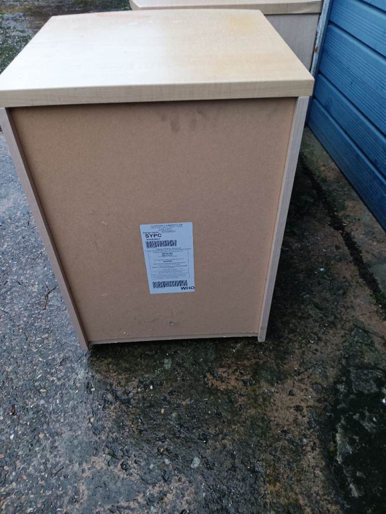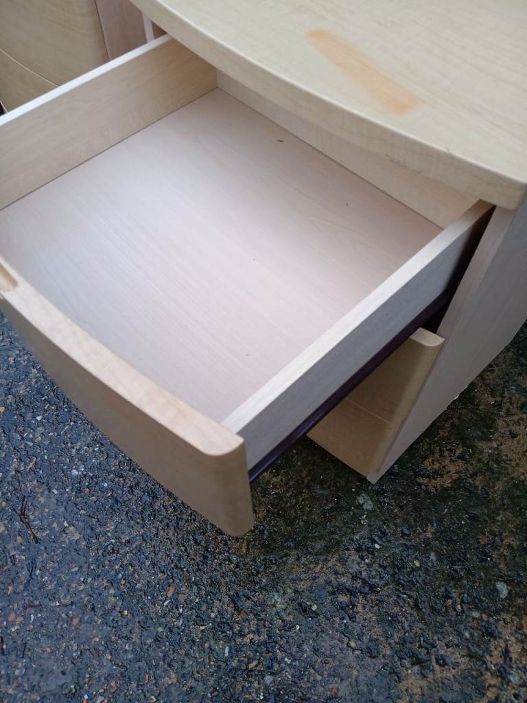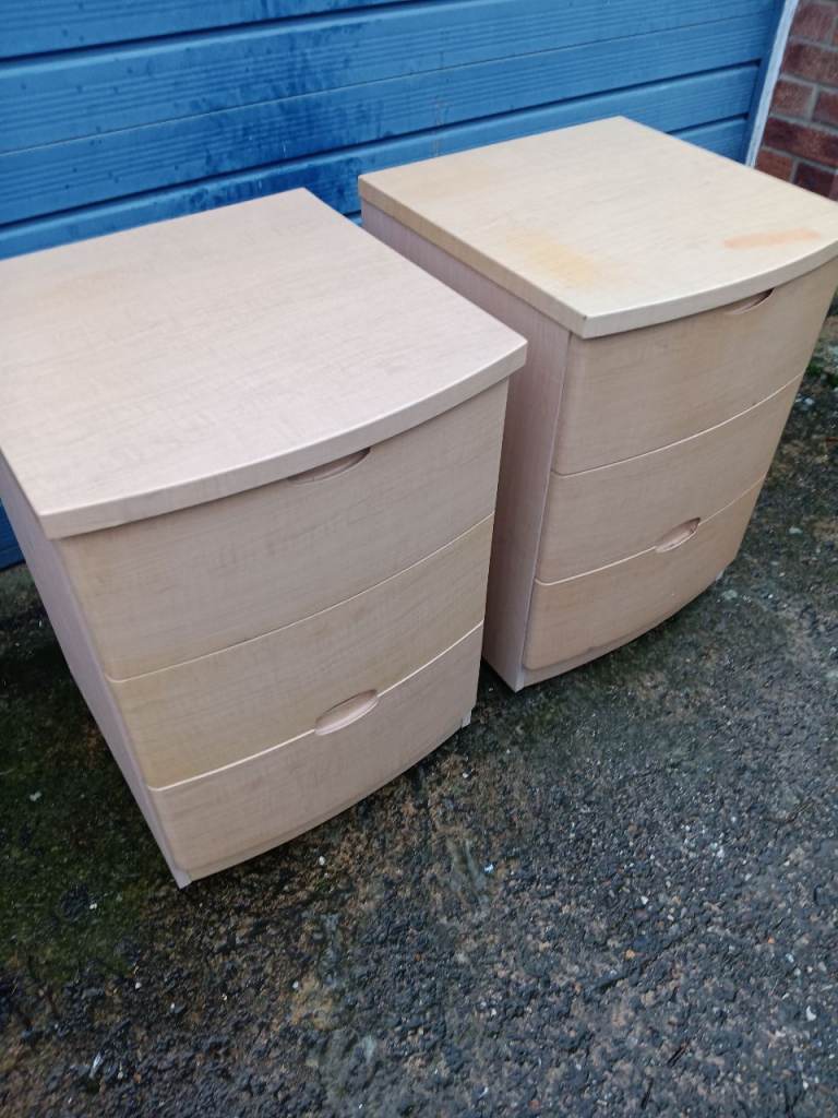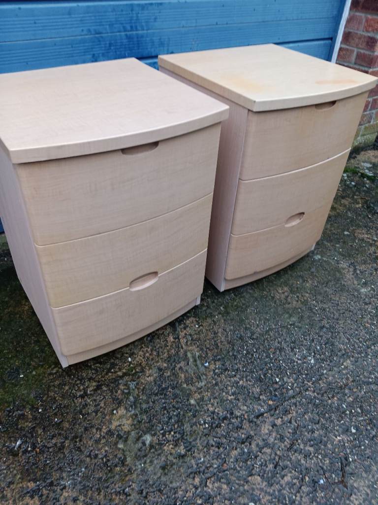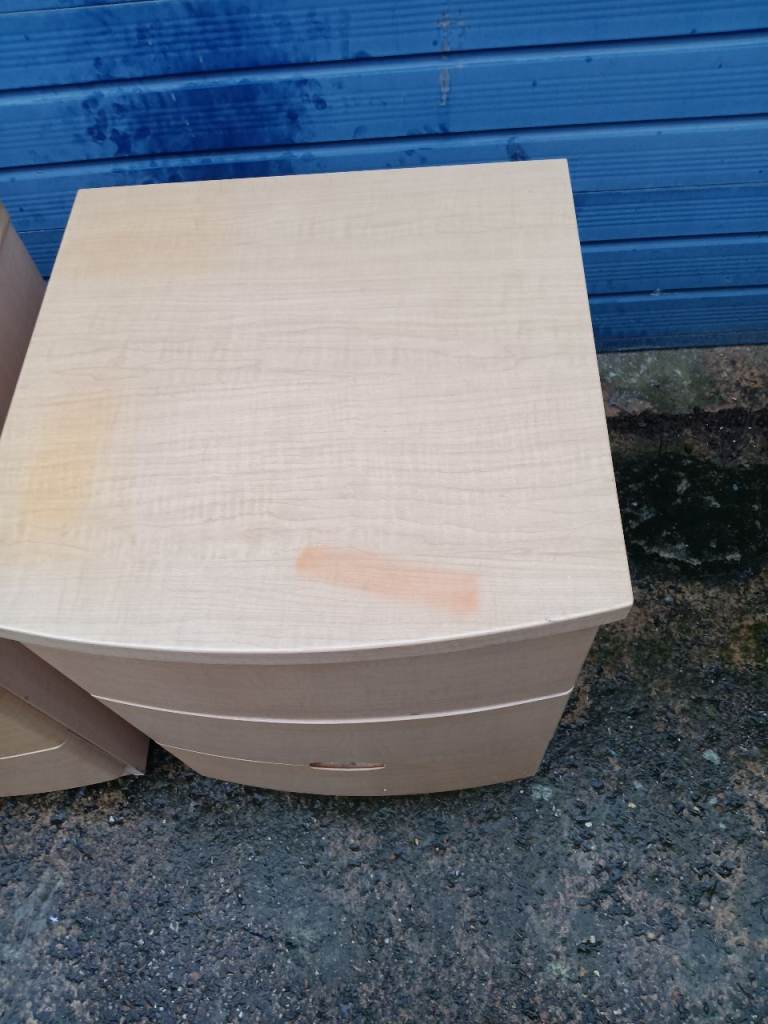 A matching pair of Alstons bow fronted bedside drawers, both are in nice condition, one does have a mark on it as shown in pictures. Both consists of soft closing drawers, three drawers each and stands on wheels. All measurements are on photos.